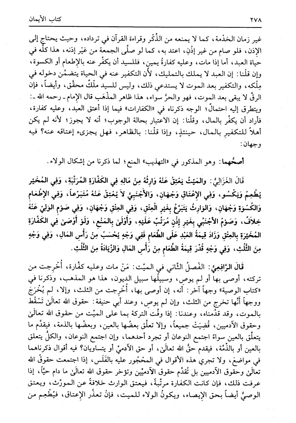 قال الرَّاِفعِيُّ: الفْصلُ الثَّاني في الميِّت: مَنْ مات وعليه كفَّارة , أُخْرِجت من تركته، أوصى بها أو لم يوص، وسبيلُها سبيل الديون، هذا هو المذهب، وذكرنا في "كتاب الوصية" وجهاً آخر: أَنه، إن أوصى بها، أُخْرِجت من الثلث، وإلا، لم يُخْرَجَ ووجهاً أنَّها تَخْرُج من الثلث، وإن لم يوصِ، وعند أبي حنيفة: حقوق الله تعالَى تَسْقُط بالموت، وقد قدَّمناه، وعندنا: إذا وفَّت التركة بما على الميت من حقوق الله تعالَى وحقوق الاَدميين، قُضِيَتْ جميعاً، وإلا تعلَّق بعضُها بالعين، وبعضُها بالذمة، فيقدَّم ما يتعلَّق بالعين سواءٌ اجتمع النوعان أو تجرد أحدهما، وإن اجتمع النوعان، والكلُّ يتعلق بالعين أو بالذِّمَّة، فيقدم حقُّ الله تعالَى، أو حق الآدميّ أو يتساويان؟ فيه أقوال ذكرناهما في مواضعَ، ولا تجري هذه الأقوال ذي المحْجُور عليه بالفَلَس، إذا اجتمعت حقوقُ الله تعالَى وحقوق الآدميين بل تُقدَّم حقوق الآدميِّين وتؤخر حقوق الله تعالَى ما دام حيّاً، إذا عرفت ذلك، فإن كانت الكفارة مرتبةً، فيعتق الوارث خلافةً عن المورِّث، ويعتق الوصيُّ أيضاً بحق الإِيصاء، ويكونُ الولاء للميت، فإنْ تعذَّر الإِعتاق، فيُطْعِم من