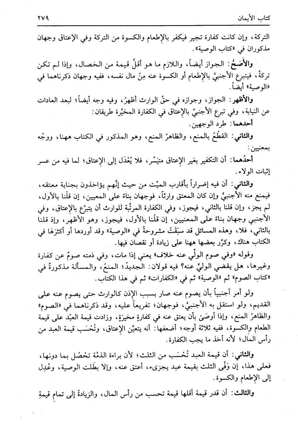 والثاني: أن فيه إضراراً بأقارب الميِّت من حيث إنَّهم يؤاخذون بجناية معتقه، فيمنع منه الأجنبيُّ وإن كان المعتق وارثاً، فوجهان بناء على المعيين، إن قلْنا بالأول، لم يجز، وإن قلنا بالثاني، فيجوز، وفي الكفارة المرتَّبة للوارث أن يتبرَّع بالإعتاق، وفي الأجنبي وجهان بناءً على المعنيين، إن قلْنا بالأول، فيجوز، وهو الأظهر، وإذ قلنا بالثاني، فلا، وهذه المسائل قد سبَقَتْ مشروحة في "الوصية" وقد أوردها أو أكثرَهَا في الكتاب هناك، وكرَّر بعضها هاهنا على زيادة أو نقصان فيها.