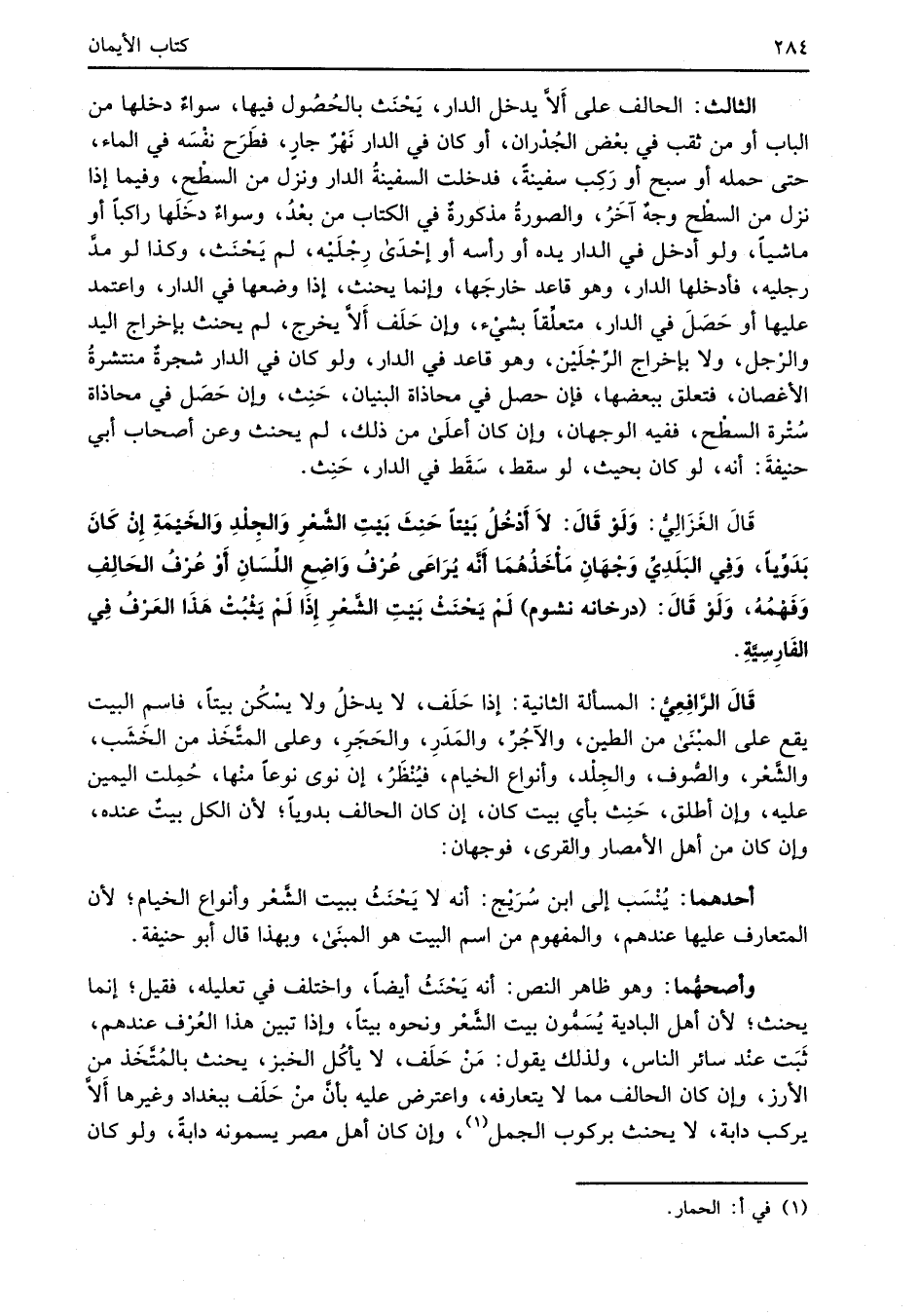 قَالَ الْغَزَالِيُّ: وَلَوْ قَالَ: لاَ أَدْخُلُ بَيتاً حَنِثَ بَيْتِ الشَّعْرِ وَالجِلْدِ وَالخَيْمَةِ إِنْ كَانَ بَدَوِّياً، وَفِي البَلَدِيِّ وَجْهَانِ مَأْخَذُهُمَا أنَّه يُرَاعَى عُرْفُ وَاضِعِ اللِّسَانِ أَوْ عُرف الحَالِفِ وَفَهْمُهُ، وَلَوْ قَالَ: (درخانه نشوم) لَمْ يَحْنَثْ بَيْتِ الشِّعْرِ إِذَا لَمْ يَثْبُتْ هَذَا العَرْفُ فِي الفَارِسِيَّةِ.