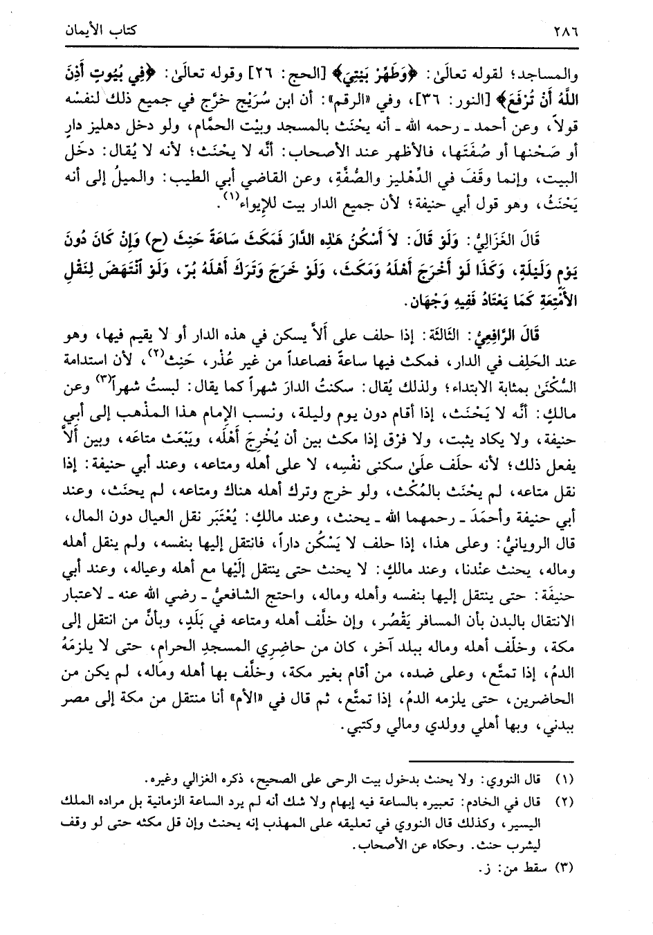 قَالَ الرَّافِعِيُّ: الثَالثَة: إذا حلف على أَلاَّ يسكن في هذه الدار أو لا يقيم فيها، وهو عند الحَلِف في الدار، فمكث فيها ساعةً فصاعداً من غير عُذْر، حَنِث (¬2) , لأن استدامة السُّكْنَى بمثابة الابتداء؛ ولذلك يُقال: سكنتُ الدارَ شهراً كما يقال: لبستُ شهرًا (¬3) وعن مالكٍ: أنه لا يَحْنَث، إذا أقام دون يوم وليلة، ونسب الإِمام هذا المذهب إلى أبي حنيفة، ولا يكاد يثبت، ولا فرق إذا مكث بين أن يُخْرِجَ أَهْلَه، وَيبْعَث متاعَه، وبين أَلاَّ يفعل ذلك؛ لأنه حلَف عَلَى سكنى نفْسِه، لا على أهله ومتاعه، وعند أبي حنيفة: إذا نقل متاعه، لم يحْنَث بالمُكْث، ولو خرج وترك أهله هناك ومتاعه، لم يحنَث، وعند أبي حنيفة وأحمَدَ -رحمهما الله- يحنث، وعند مالكٍ: يُعْتَبَر نقل العيال دون المال، قال الرويانيُّ: وعلى هذا، إذا حلف لا يَسْكُن داراً، فانتقل إليه بنفسه، ولم ينقل أهله وماله، يحنث عنْدنا، وعند مالك: لا يحنث حتى ينتقل إلَيْها مع أهله وعياله، وعند أبي حنيفَة: حتى ينتقل إليه ابن فسه وأهله وماله، واحتج الشافعيُّ -رضي الله عنه- لاعتبار الانتقال بالبدن بان المسافر يَقْصُر، وإن خلَّف أهله ومتاعه في بَلَدٍ، وبأنَّ من انتقل إلى مكة، وخلّف أهله وماله ببلد آخر، كان من حاضِرِي المسجدِ الحرامِ، حتى لا يلزمَهُ الدمُ، إذا تمتَّع، وعلى ضده، من أقام بغير مكة، وخلَّف بها أهله وماله، لم يكن من الحاضرين، حتى يلزمه الدمُ، إذا تمتَّع، ثم قال في "الأم" أنا منتقل من مكة إلى مصر ببدني، وبها أهلي وولدي ومالي وكتبي.