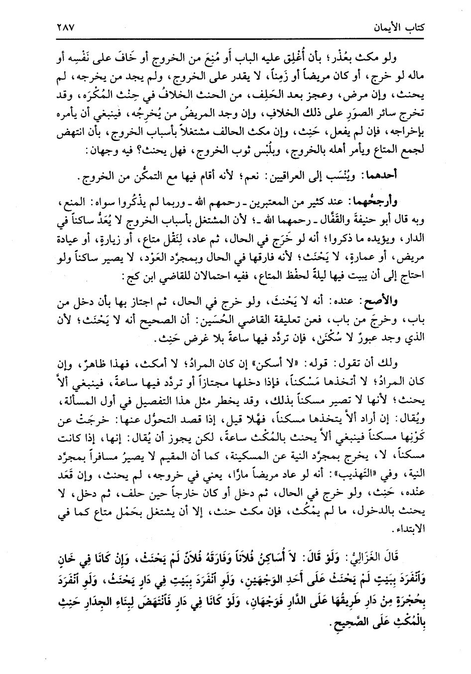 وأرجحُّهما: عند كثير من المعتبرين -رحمهم الله- وربما لم يذْكُروا سواه: المنع، وبه قال أبو حنيفةَ والقَفَّال -رحمهما الله-؛ لأن المشتغل بأسباب الخروج لا يُعَدُّ ساكناً في الدار، ويؤيده ما ذكروا؛ أنه لو خَرَج في الحال، ثم عاد، لِنَقْل متاع، أو زيارةٍ، أو عيادة مريض، أو عمارةٍ، لا يَحْنَث؛ لأنه فارقها في الحال وبمجرَّد العَوْد، لا يصير ساكنًا ولو احتاج إلى أن يبيت فيها ليلةً لحفْظ المتاع، ففيه احتمالان للقاضي ابن كج:
