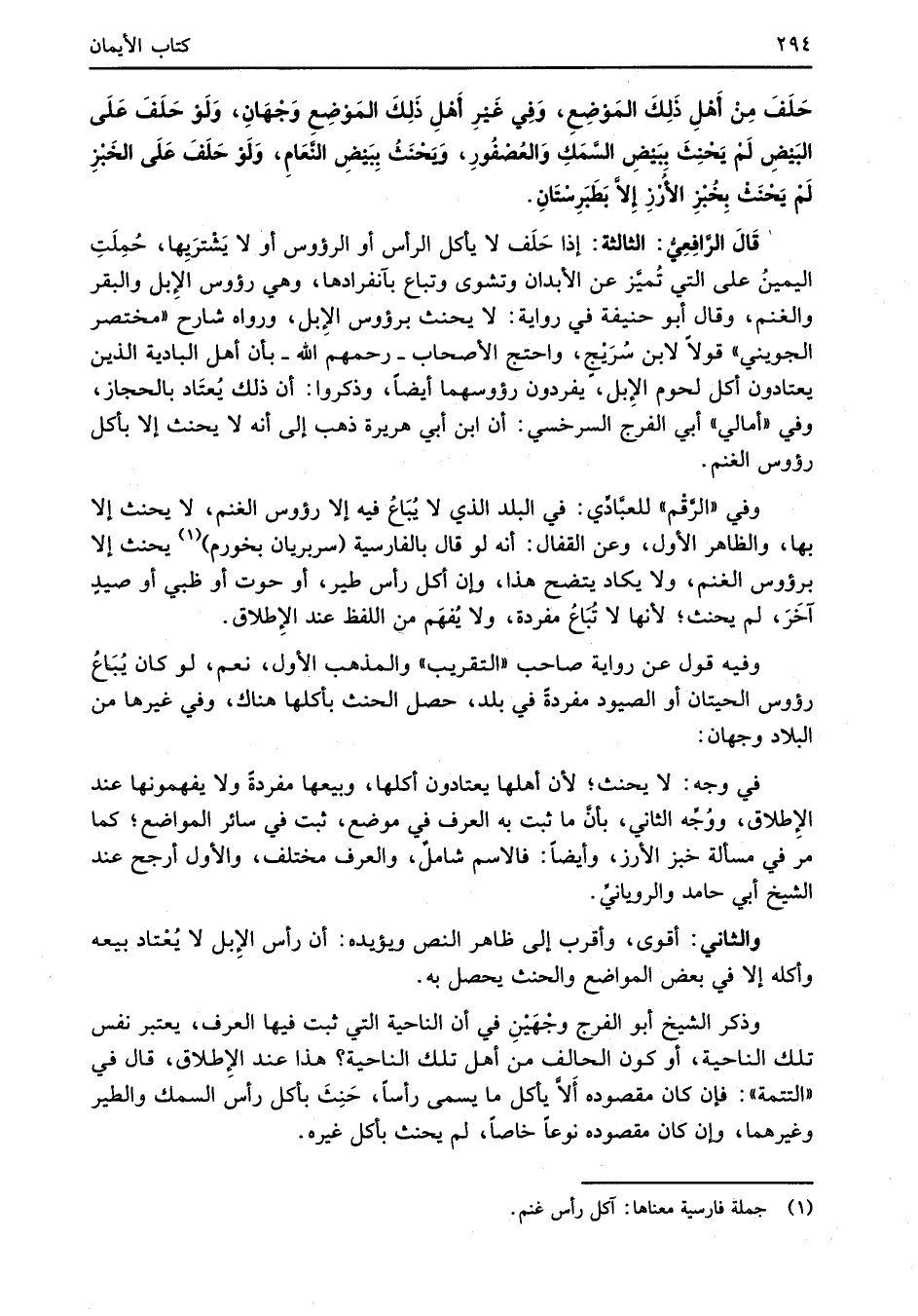 وذكر الشيخ أبو الفرج وجْهَيْنِ في أن الناحية التي ثبت فيها العرف، يعتبر نفس تلك الناحية، أو كون الحالف من أهل تلك الناحية؟ هذا عند الإِطلاق، قال في "التتمة": فإن كان مقصوده أَلاَّ يأكل ما يسمى رأساً، حَنِثَ بأكل رأس السمك والطير وغيرهما، وإن كان مقصوده نوعًا خاصاً، لم يحنث بأكل غيره.