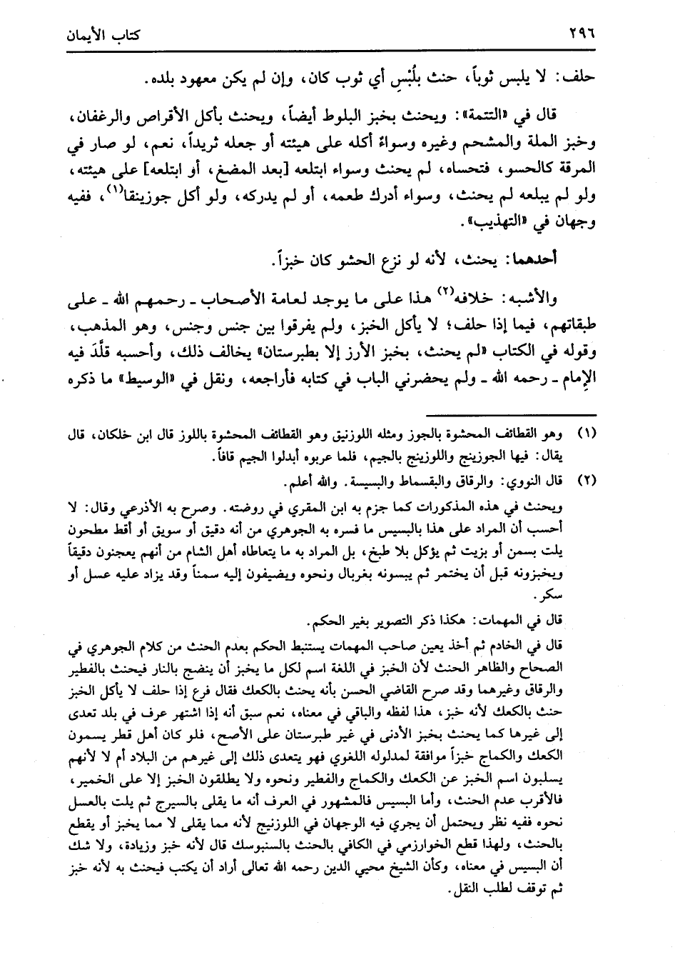 قال في الخادم ثم أخذ يعين صاحب المهمات يستنبط الحكم بعدم الحنث من كلام الجوهري في الصحاح والظاهر الحنث لأن الخبز في اللغة اسم لكل ما يخبز أن ينضج بالنار فيحنث بالفطير والرقاق وغيرهما وقد صرح القاضي الحسن بأنه يحنث بالكعك فقال فرع إذا حلف لا يأكل الخبز حنث بالكعك لأنه خبز، هذا لفظه والباقي في معناه، نعم سبق أنه إذا اشتهر عرف في بلد تعدى إلى غيرها كما يحنث بخبز الأدنى في غير طبرستان على الأصح، فلو كان أهل قطر يسمون الكعك والكماج خبزاً موافقة لمدلوله اللغوي فهو يتعدى ذلك إلى غيرهم من البلاد أم لا لأنهم يسلبون اسم الخبز عن الكعك والكماج والفطير ونحوه ولا يطلقون الخبز إلا على الخمير، فالأقرب عدم الحنث، وأما البسيس فالمشهور في العرف أنه ما يقلى بالسيرج ثم يلت بالعسل نحوه ففيه نظر ويخمل أن يجري فيه الوجهان في اللوزنيج لأنه مما يقلى لا مما يخبز أو يقطع بالحنث، ولهذا قطع الخوارزمي في الكافي بالحنث بالسنبوسك قال لأنه خبز وزيادة، ولا شك أن البسيس في معناه، وكان الشيخ محيي الدين رحمه الله تعالى أراد أن يكتب فيحنث به لأنه خبز ثم توقف لطلب النقل.