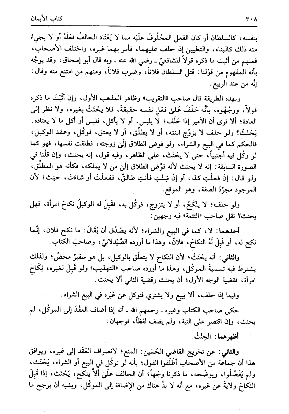 والثاني: عن تخريج القاضي الحُسَين: المنع؛ لانصراف العَقْد إلى غيره، ويوافق هذا أن جماعة من الأصحاب أطْلَقوا القول؛ بأنه لو توكَّل في البيع أو الشراء، يَحْنَثْ، ولم يُفَصِّلُوا، ويوضِّحه، ما ذكرنا وجْهًا؛ أن الحالف عَلَى ألاَّ ينكح، يَحْنَثْ، إذا قَبِلَ النكاحَ ولايةً عن غيره، مع أنه لا بدَّ هناك من الإِضافة إلى الموكِّل، ويشبه أن يرجح ما