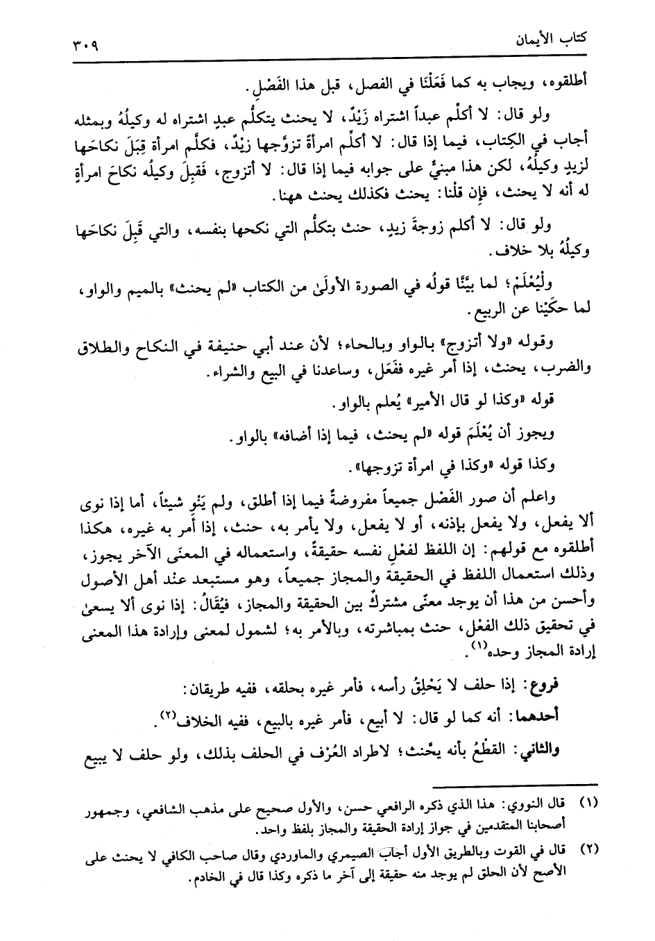 واعلم أن صور الفَصْل جميعًا مفروضةٌ فيما إذا أطلق، ولم يَنْوِ شيئًا، أما إذا نوى ألا يفعل، ولا يفعل بإذنه، أو لا يفعل، ولا يأمر به، حنث، إذا أمر به غيره، هكذا أطلقوه مع قولهم: إن اللفظ لفعْلِ نفسه حقيقةٌ، واستعماله في المعنَى الآخر يجوز، وذلك استعمال اللفظ في الحقيقة والمجاز جميعًا، وهو مستبعد عنْد أهل الأصول وأحسن من هذا أن يوجد معنًى مشتركٌ بين الحقيقة والمجاز، فيُقَالُ: إذا نوى ألا يسعى في تحقيق ذلك الفعْل، حنث بمباشرته، وبالأمر به؛ لشمول لمعنى وإرادة هذا المعنى إرادة المجاز وحده (¬1).