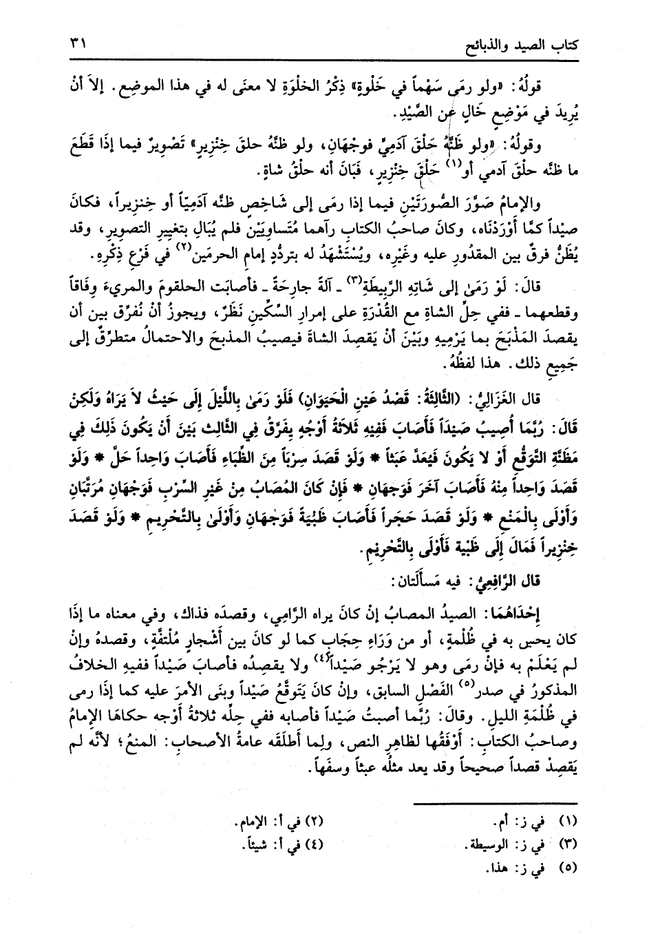 قال الغَزَالِيُّ: (الثَّالِثَةُ: قَصْدُ عَيْنِ الْحيَوَانِ) فَلَوْ رَمَى بِاللَّيْلَ إِلَى حَيْثُ لاَ يَرَاهُ وَلَكِنْ قَالَ: رُبَّمَا أُصِيبُ صَيْدًا فأصَابَ فَفِيْهِ ثَلاَثةُ أَوْجُهٍ يِفَرَّقُ في الثَّالِث بَيْنَ أَنْ يَكُونَ ذَلِكَ فِي مَظَنَّةِ التَّوَقُّعِ أَوْ لا يَكُونَ فَيُعَدَّ عَبَثًا* وَلَوْ قَصَدَ سِرْبَاً مِنَ الظِّبَاءِ فأصَابَ وَاحِداً حَلَّ* وَلَوْ قَصَدَ وَاحِداً مِنْهُ فَأصَابَ آخَرَ فَوَجْهَانِ* فَإِنْ كَانَ المُصَابُ مِنْ غَيْرِ السِّرْبِ فَوَجْهَانِ مُرَتَّبَانِ وَأَوْلَى بِالْمنْعِ* وَلَوْ قَصَدَ حَجَرًا فَأصَابَ ظَبيَةً فَوَجْهَانِ وَأَوْلَى بِالتَّحْرِيمِ* وَلَوْ قَصَدَ خِنْزِيراً فَمَالَ إِلَى ظَبْية فَأوْلَى بِالتَّحْرِيْمِ.