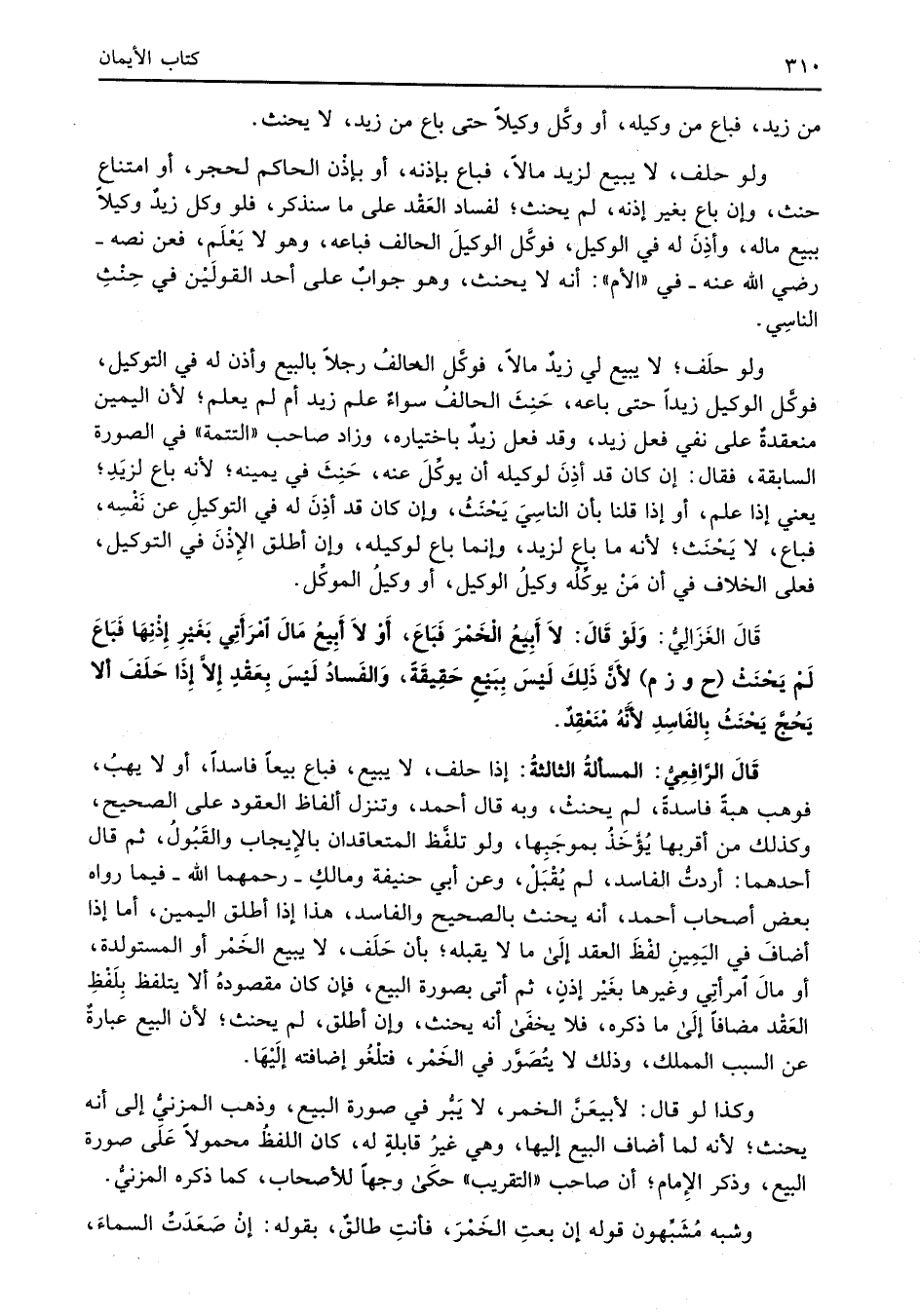قَالَ الغَزَالِيُّ: وَلَوْ قَالَ: لاَ أَبِيعُ الْخَمْرَ فَبَاعَ، أَوْ لاَ أَبِيعُ مَالَ امْرَأَتِي بَغَيْرِ إِذْنِهَا فَبَاعَ لَمْ يَحْنَثْ (ح وز م) لأَنَّ ذَلِكَ لَيْسَ بِبَيْعٍ حَقِيقَةً، وَالفَسادُ لَيْسَ بِعَقْدِ إلاَّ إِذَا حَلَفَ ألا يَحُجَّ يَحْنَثُ بِالفَاسِدِ لأَنَّهُ مْنَعْقِدٌ.