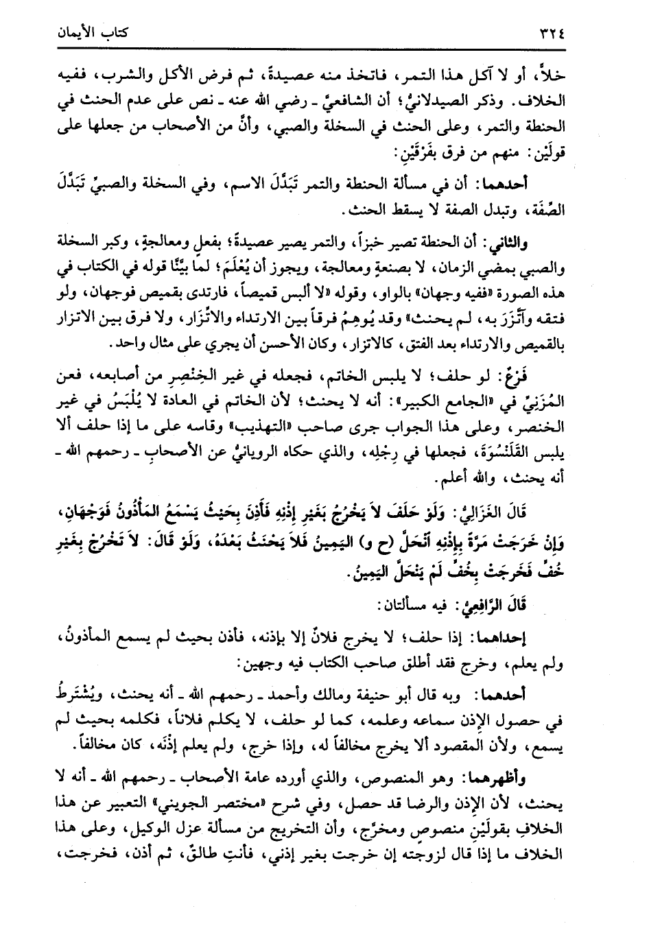 والثاني: أن الحنطة تفسير خبزًا، والتمر يصير عصيدةً؛ بفعلٍ ومعالجةٍ، وكبر السخلة والصبي بمضي الزمان، لا بصنعةٍ ومعالجة، ويجوز أن يُعْلَمَ؛ لما بيَّنَّا قوله في الكتاب في هذه الصورة "ففيه وجهان" بالواو، وقوله "لا ألبس قميصًا، فارتدى بقميص فوجهان، ولو فتقه واتَّزَرَ به، لم يحنث" وقد يُوهِمُ فرقًا بين الارتداء والاتِّزَار، ولا فرق بين الاتزار بالقميص والارتداء بعد الفتق، كالاتزار، وكان الأحسن أن يجري على مثال واحد.