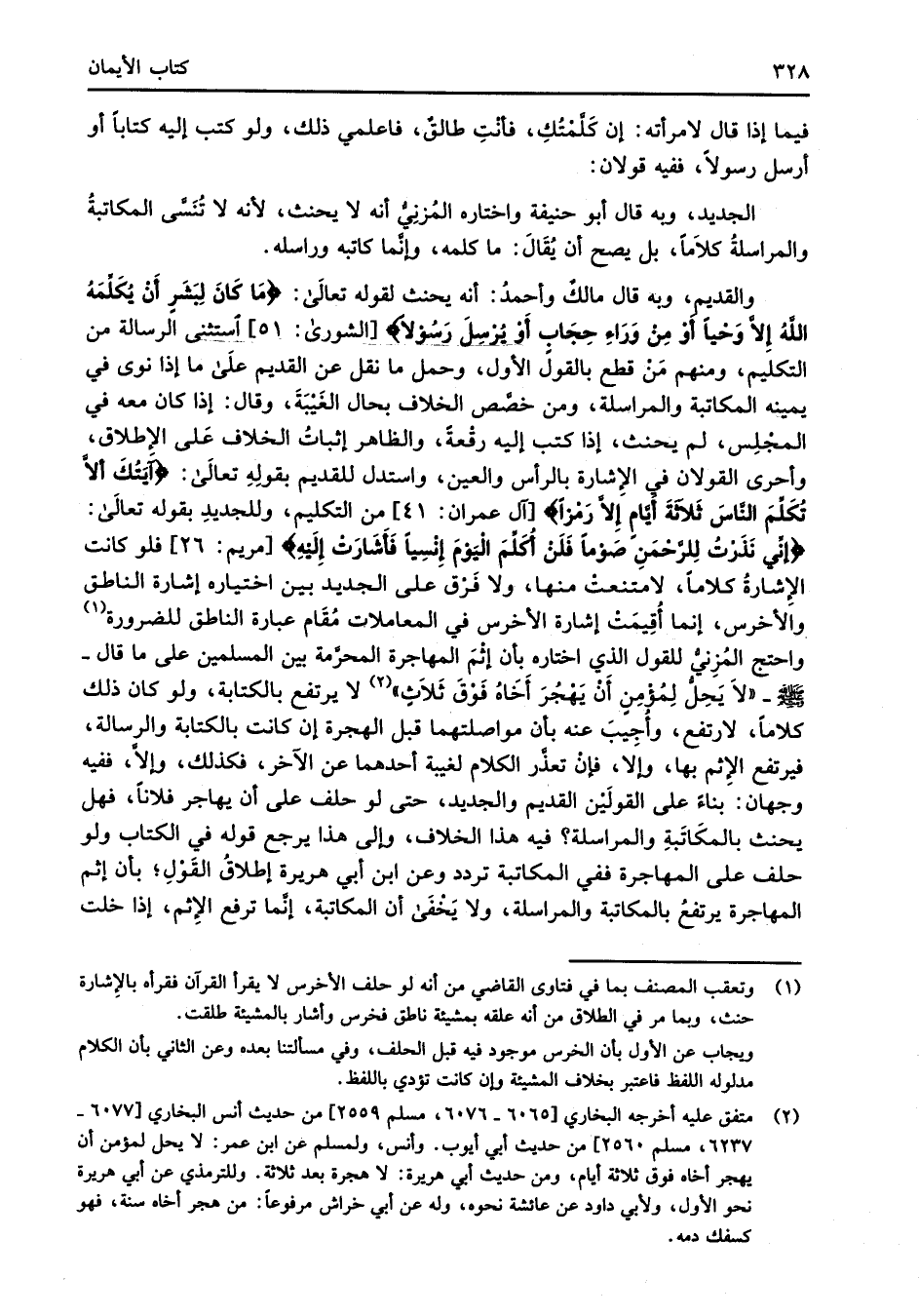 والقديم، وبه قال مالكٌ وأحمدُ: أنه يحنث لقوله تعالَى: {مَا كَانَ لِبَشَرٍ أَنْ يُكَلِّمَهُ اللَّهُ إِلاَّ وَحْيًا أَوْ مِنْ وَرَاءِ حِجَابٍ أَوْ يُرْسِلَ رَسُولًا} [الشورى: 51] استثنى الرسالة من التكليم، ومنهم مَنْ قطع بالقول الأول، وحمل ما نقل عن القديم علَى ما إذا نوى في يمينه المكاتبة والمراسلة، ومن خصَّص الخلاف بحال الغَيْبَةَ، وقال: إذا كان معه في المجْلِس، لم يحنث، إذا كتب إليه رقْعةً، والظاهر إثباتُ الخلاف عَلى الاِطلاق، وأحرى القولان في الإِشارة بالرأس والعين، واستدل للقديم بقولِهِ تعالَى: {آيَتُكَ أَلَّا تُكَلِّمَ النَّاسَ ثَلَاثَةَ أَيَّامٍ إِلاَّ رَمْزًا} [آل عمران: 41] من التكليم، وللجديدِ بقوله تعالَى: {إِنِّي نَذَرْتُ لِلرَّحْمَنِ صَوْمًا فَلَنْ أُكَلِّمَ الْيَوْمَ إِنْسِيًّا} [مريم: 26] {فَأَشَارَتْ إِلَيْهِ} فلو كانت الإِشارةُ كلامًا، لامتنعتْ منها، ولا فَرْق على الجديد بين اختياره إشارة الناطق والأخرس، إنما أُقِيمَتْ إشارة الأخرس في المعاملات مُقَام عبارة الناطق للضرورة (¬1) واحتج المُزِنيُّ للقول الذي اختاره بأن إثْمَ المهاجرة المحرَّمة بين المسلمين على ما قال -صلى الله عليه وسلم- "لا يَحِلُّ لِمُؤْمِنٍ أَنْ يَهْجُرَ أَخَاهُ فَوْقَ ثَلاثٍ" (¬2) لا يرتفع بالكتابة، ولو كان ذلك كلامًا، لارتفع، وأُجِيبَ عنه بأن مواصلتهما قبل الهجرة إن كانت بالكتابة والرسالة، فيرتفع الإِثم بها، وإلا، فإنْ تعذَّر الكلام لغيبة أحدهما عن الآخر، فكذلك، وإلاَّ، ففيه وجهان: بناءً على القولَيْن القديم والجديد، حتى لو حلف على أن يهاجر فلانًا، فهل يحنث بالمكَاتَبةِ والمراسلة؟ فيه هذا الخلاف، وإلى هذا يرجع قوله في الكتاب ولو حلف على المهاجرة ففي المكاتبة تردد وعن ابن أبي هريرة إطلاقُ القَوْلِ؛ بأن إثم المهاجرة يرتفعُ بالمكاتبة والمراسلة، ولا يَخْفَى أن المكاتبة، إنَّما ترفع الإِثم، إذا خلت