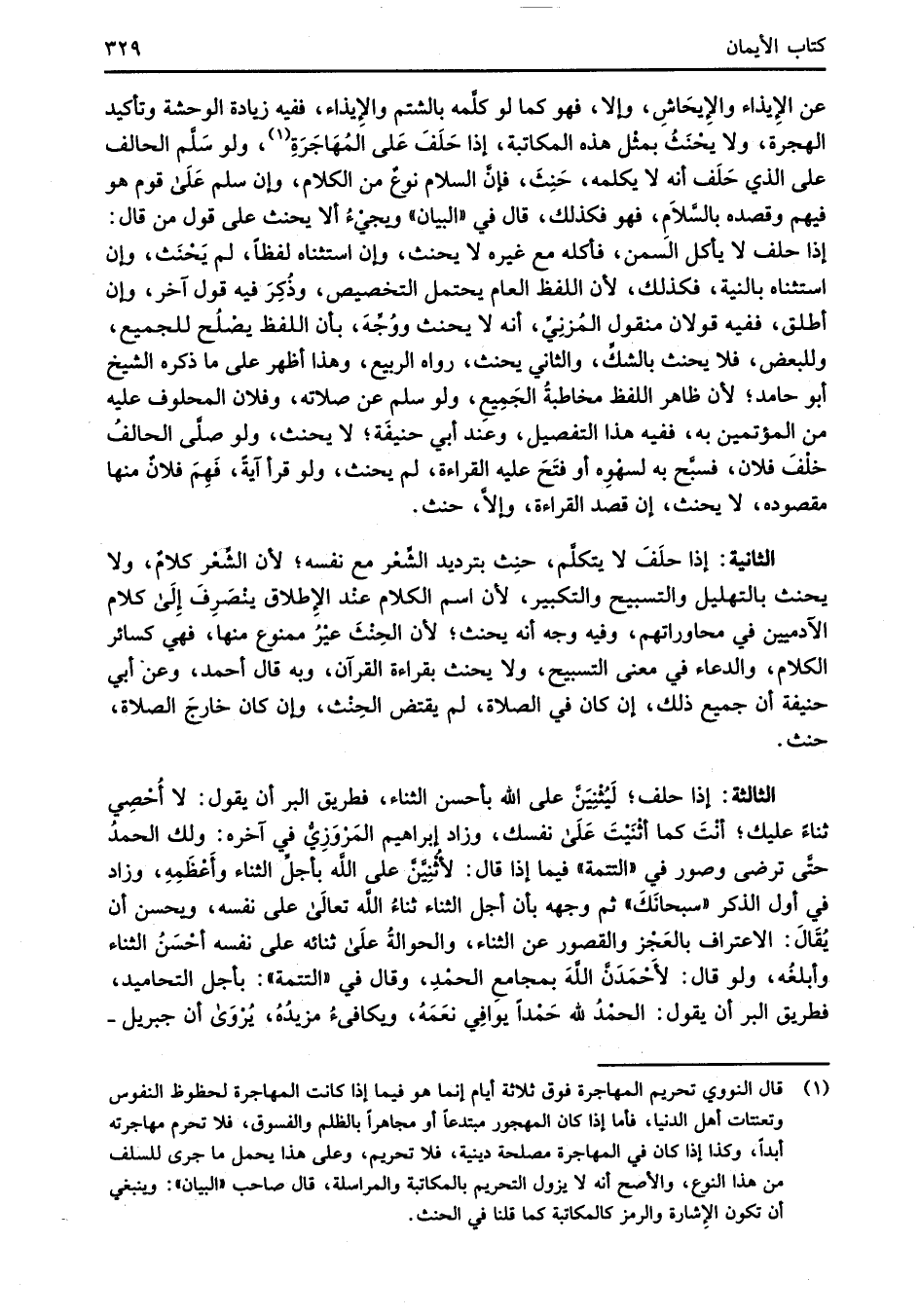 الثانية: إذا حلَفَ لا يتكلَّم، حنِث بترديد الشِّعْر مع نفسه؛ لأن الشِّعْر كلامٌ، ولا يحنث بالتهليل والتسبيح والتكبير؛ لأن اسم الكلام عنْد الإِطلاق ينْصَرِفَ إِلَى كلام الآدميين في محاوراتهم، وفيه وجه أنه يحنث؛ لأن الحِنْثَ عيْرُ ممنوع منها، فهي كسائر الكلام، والدعاء في معنى التسبيح، ولا يحنث بقراءة القرآن، وبه قال أحمد، وعن أبي حنيفة أن جميع ذلك، إن كان في الصلاة، لم يقتض الحِنْث، لأن كان خارجَ الصلاة، حنث.