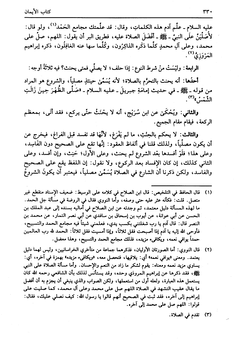 (¬2) قال النووي: أما الصورتان الأوليان، فذكرهما جماعة من متأخري الخراسانيين، وليس لهما دليل يعتمد. ومعنى "يوافي نعمه" أي: يلاقيها، فتحصل معه، "ويكافئ مزيده" بهمزة في آخره، أي: يساوي مزيد نعمه ومعناه: يقوم لشكر ما زاد من النحم والإِحسان. وأما مسألة الصلاة على النبي -صلى الله عليه وسلم-، فقد ذكرها عن إبراهيم المروذي وحده، وقد يستأنس لذلك بأن الشافعي رحمه الله وإن يستعمل هذه العبارة، ولعله أول من استعملها، ولكن الصواب والذي ينبغي أن يجزم به أن أفضل ما يقال عقيب التشهد في الصلاة اللهم صل على محمد وعلى آل محمد، كما صليت على إبراهيم إلى آخره، فقد ثبت في الصحيح أنهم قالوا يا رسول الله: كيف نصلي عليك، فقال: قولوا: اللهم صل على محمد إلى آخره.