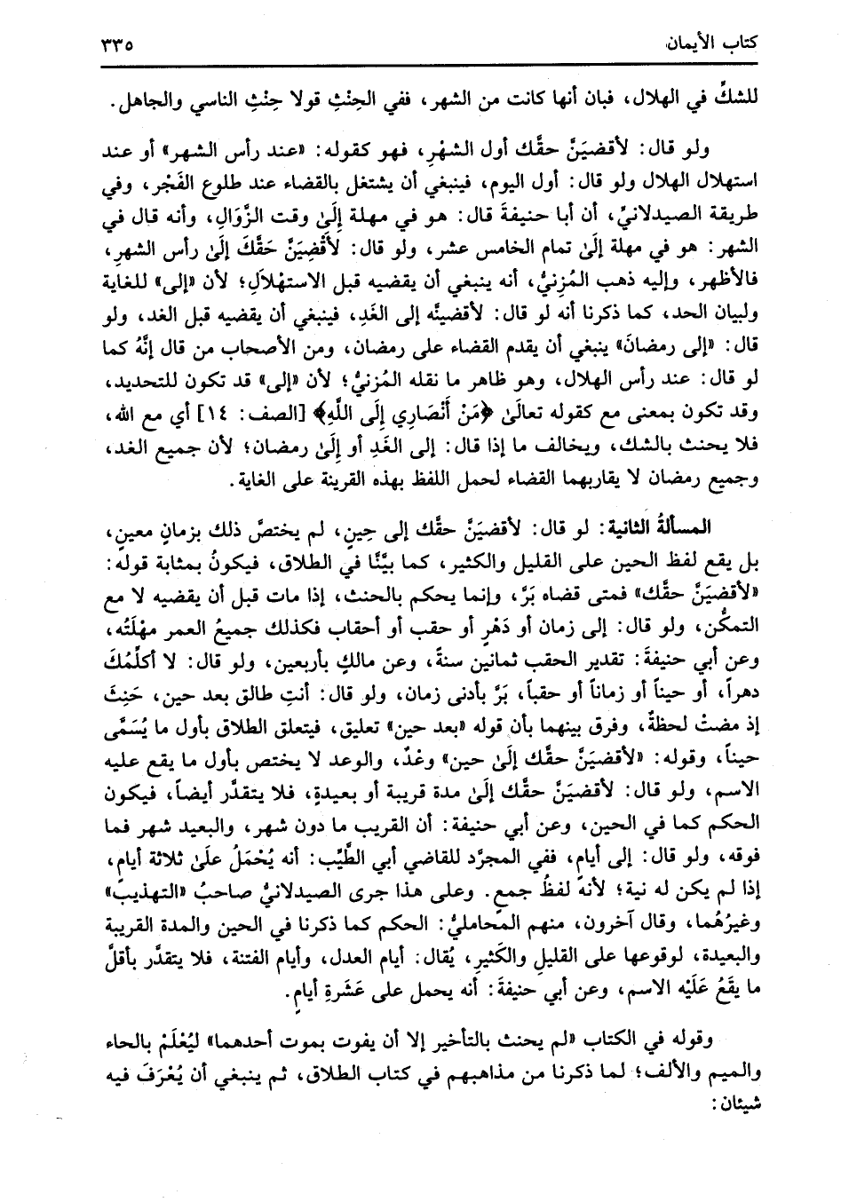 ولو قال: لأقضيَنَّ حقَّك أول الشهْرِ، فهو كقوله: "عند رأس الشهر" أو عند استهلال الهلال ولو قال: أول اليوم، فينبغي أن يشتغل بالقضاء عند طلوع الفَجْر، وفي طريقة الصيدلانيِّ، أن أبا حنيفةَ قال: هو في مهلة إِلَى وقت الزَّوَالِ، وأنه قال في الشهر: هو في مهلة إلَى تمام الخامس عشر، ولو قال: لأَقْضِيَنَّ حَقَّكَ إلَى رأس الشهرِ، فالأظهر، وإليه ذهب المُزنيُّ، أنه ينبغي أن يقضيه قبل الاستهْلاَلِ؛ لأن "إلى" للغاية ولبيان الحد، كما ذكرنا أنه لو قال: لأقضينَّه إلى الغَدِ، فينبغي أن يقضيه قبل الغد، ولو قال: "إلى رمضانَ" ينبغي أن يقدم القضاء على رمضان، ومن الأصحاب من قال إنَّهُ كما لو قال: عند رأس الهلال، وهو ظاهر ما نقله المُزنيُّ؛ لأن "إلى" قد تكون للتحديد، وقد تكون بمعنى مع كقوله تعالَى {من أَنْصَارِي إِلَى اللهِ} [الصف: 14] أي مع الله، فلا يحنث بالشك، ويخالف ما إذا قال: إلى الغَدِ أو إِلَى رمضان؛ لأن جميع الغد، وجميع رمضان لا يقاربهما القضاء لحمل اللفظ بهذه القرينة على الغاية.