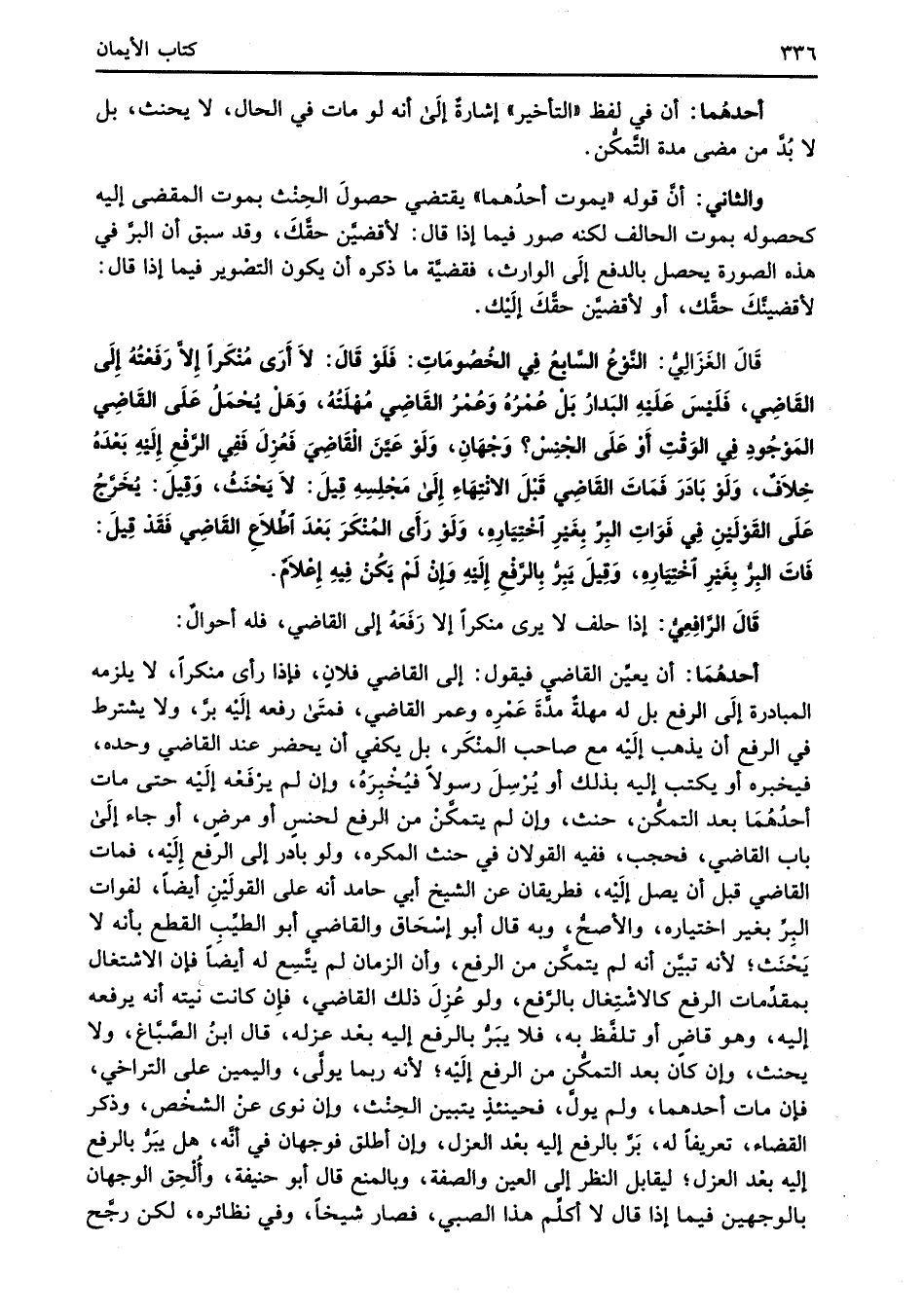 قَالَ الغَزَالِيُّ: النَّوْعُ السَّابعُ فِي الخُصُومَاتِ: فَلَوْ قَالَ: لاَ أَرَى مُنْكَراً إِلاَّ رَفَعْتُهُ إِلَى القَاضِي، فَلَيْسَ عَلَيْهِ البَدارُ بَلْ عُمْرُهُ وَعُمْرُ القَاضِي مُهْلَتُهُ، وَهَلْ يُحْمَلُ عَلَى القَاضِي المَوْجُودِ فِي الوَقْتِ أَوْ عَلَى الجْنِسْ؟ وَجْهَانِ، وَلَوْ عَيَّنَ الْقَاضِيَ فَعُزِلَ فَفِي الرَّفْعِ إِلَيْهِ بَعْدَهُ خِلاَفٌ، وَلَوْ بَادَرَ فَمَاتَ القَاضِي قَبْلَ الانْتِهَاءِ إِلَى مَجْلِسِهِ قِيلَ: لاَ يَحْنَثُ، وَقِيلَ: يُخَرَّجُ عَلَى القَوْلَيْنِ فِي فَوَاتِ البِرِّ بِغَيْرِ اخْتِيَارِه، وَلَوْ رَأَى المُنْكرَ بَعْدَ اطَّلاَعَ القَاضِي فَقَدْ قِيلَ: فَاتَ البِرُّ بِغَيْرِ اخْتِيَارِه، وَقِيلَ يَبِرُّ بِالرَّفْعِ إِلَيْهِ وَإِنْ لَمْ يَكُنْ فِيهِ إِعْلاَمٌ.