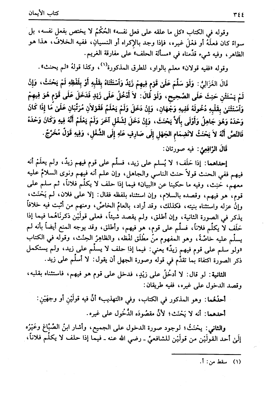 قَالَ الغَزَالِيُّ: وَلَوْ سَلَّمَ عَلَى قَوْمٍ فِيهِمْ زَيْدٌ وَاسْتَثْنَاهُ بِقَلْبِهِ أَوْ بِلَفْظِهِ لَمْ يَحْنَثْ، وَإِنْ لَمْ يَسْتَثْنِ حَنِثَ عَلَى الصَّحِيحِ، وَلَوْ قَالَ: لاَ أَدْخُلُ عَلَى زَيْدٍ فَدَخَلَ عَلَى قَوْمٍ هُوَ فِيهِمْ وَاسْتَثْنَى بِقَلْبِهِ دُخُولَهُ فَفِيهِ وَجْهَانِ، وَإِنْ دَخَلَ وَلَمْ يَعْلَمُ فَقَوْلاَنِ مُرَتَّبَانِ عَلَى مَا إِذَا كَانَ وَحْدَهُ وَهُوَ جَاهِلُ وَأَوْلَى بِأَلاَّ يَحْنَثَ، وَإِنْ دَخَلَ لِشُغْلِ آخَرَ وَلَمْ يَعْلَمْ أَنَّهُ فِيهِ وَكَانَ وَحْدَهُ فَالنَّصُّ أنَّهُ لاَ يَحْنَثُ لانْضِمَامِ الجَهْلِ إِلَى صَارِفٍ عَنْهِ إِلَى الشُّغْلِ، وَفِيهِ قَوْلٌ مُخَرَّجٌ.