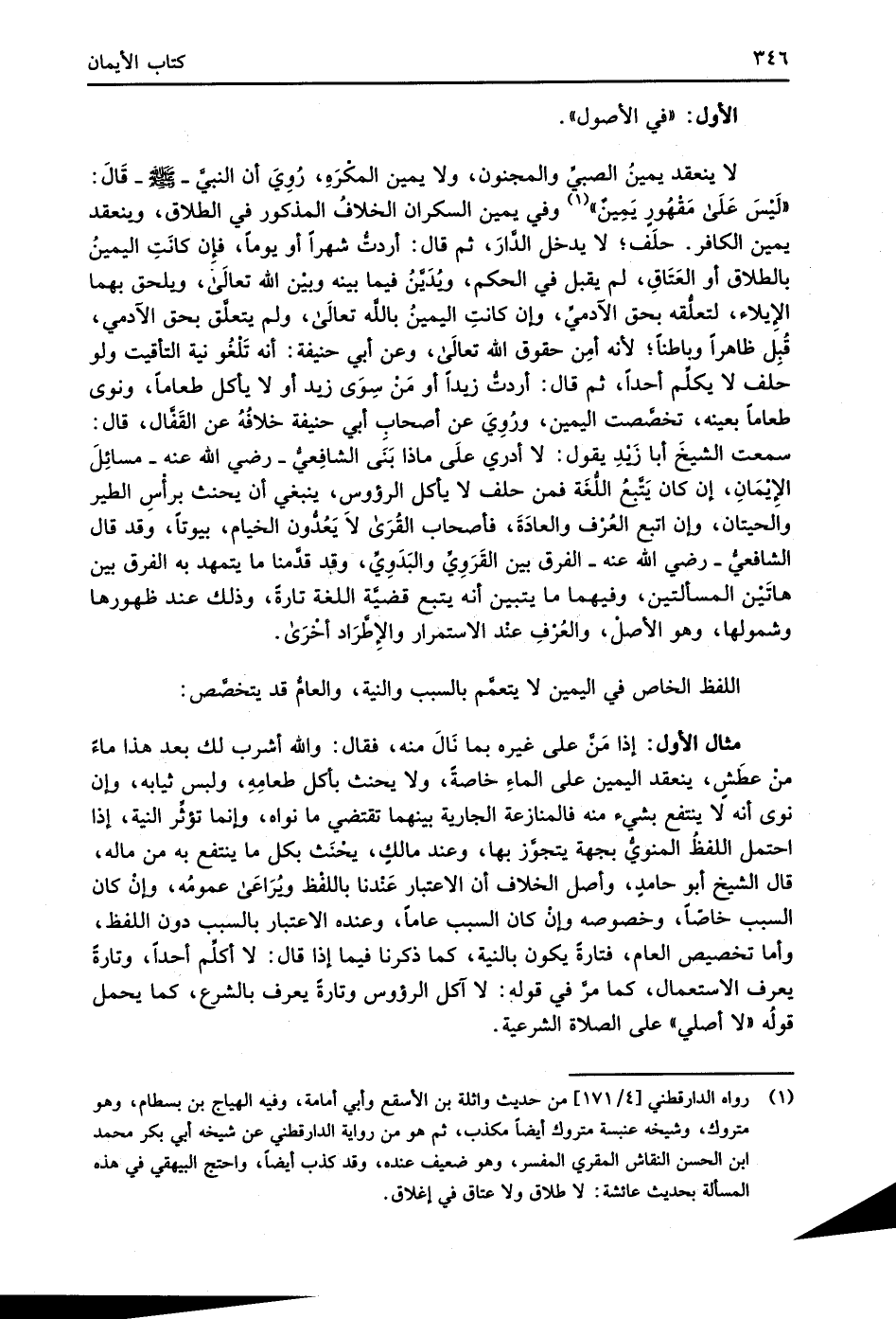 مثال الأول: إذا مَنَّ على غيره بما نَالَ منه، فقال: والله أشرب لك بعد هذا ماءً منْ عطَشٍ، ينعقد اليمين على المَاءِ خاصةً، ولا يحنث بأكل طعامِهِ، ولبس ثيابه، وإن نوى أنه لا ينتفع بشيء منه فالمنازعة الجارية بينهما تقتضي ما نواه، وإنما تؤثِّر النية، إذا احتمل اللفظُ المنويُّ بجهة يتجوَّز بها، وعند مالكٍ، يحْنَث بكل ما ينتفع به من ماله، قال الشيخ أبو حامدٍ، وأصل الخلاف أن الاعتبار عَنْدنا باللفْظ ويُرَاعَى عمومُه، وإنْ كان السبب خاصّاً، وخصوصه وإنْ كان السبب عاماً، وعنده الاعتبار بالسبب دون اللفظ، وأما تخصيص العام، فتارةً يكون بالنية، كما ذكرنا فيما إذا قال: لا أكلِّم أحداً، وتارةً يعرف الاستعمال، كما مرَّ في قول: لا آكل الرؤوس وتارةً يعرف بالشرع، كما يحمل قولُه "لا أصلي" على الصلاة الشرعية.
