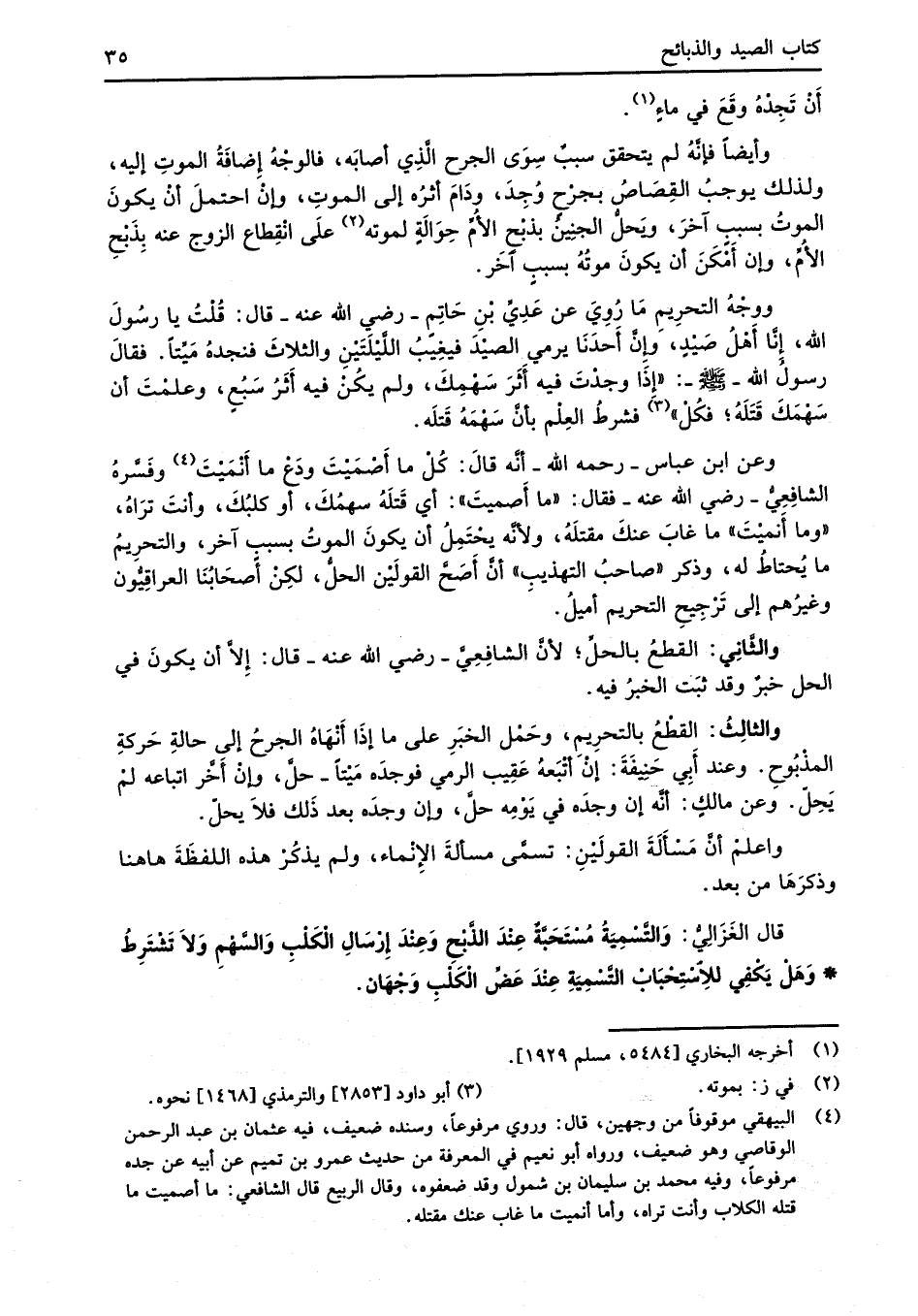 ووجْهُ التحرِيم مَا رُوِيَ عن عَدِيِّ بْنِ حَاتِمٍ -رضي الله عنه- قال: قُلْتُ يا رسُولَ الله، إنَّا أَهْلُ صَيْدٍ، وإنَّ أَحدَنَا يرمي الصيْدَ فيغِيبُ اللَّيْلَتَيْنِ والثلاثَ فنجدهُ مَيِّتًا. فقالَ رسولُ الله -صلى الله عليه وسلم-: "إذَا وجدْتَ فيه أَثَرَ سَهْمِكَ، ولم يكُنْ فيه أَثَرُ سَبُعٍ، وعلمْتَ أن سَهْمَكَ قَتَلَهُ؛ فكُلْ" (¬3) فشرطُ العِلْم بأنَّ سَهْمَهُ قَتلَه.