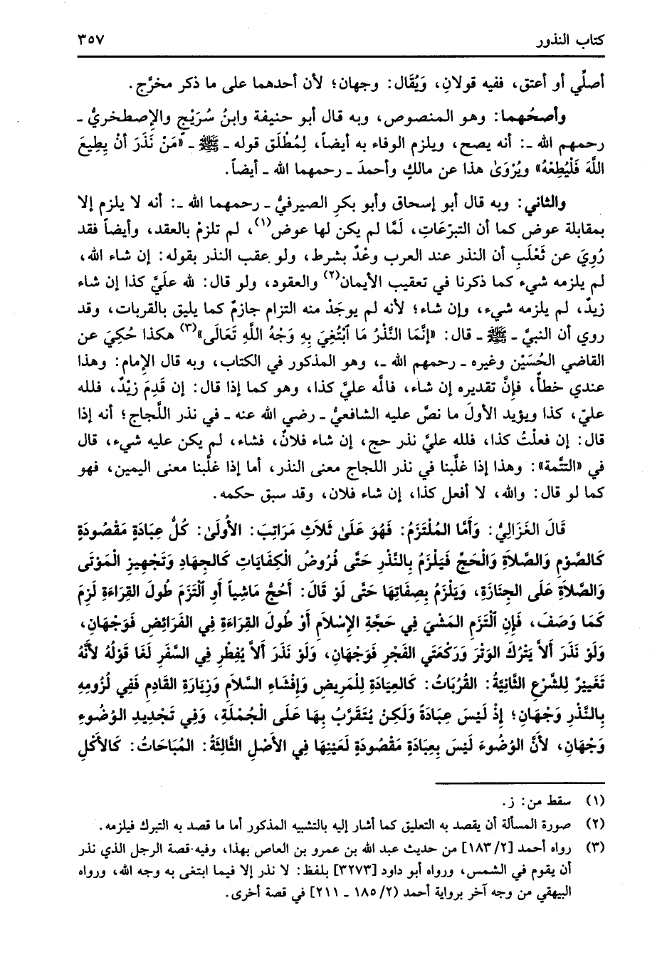 قَالَ الغَزَالِيُّ: وَأَمَّا المُلْتَزَمُ: فَهُوَ عَلَى ثَلاَثِ مَرَاتِبَ: الأُولَى: كُلُّ عِبَادَةٍ مَقْصُودَةٍ كَالصَّوْمِ وَالصَّلاَةِ وَالْحَجَّ فَيَلْزَمُ بِالنَّذْرِ حَتَّى فُرُوضُ الْكِفَايَاتِ كَالجهَادِ وَتَجْهِيزِ الْمَوْتَى وَالصَّلاَةِ عَلَى الجِنَازَةِ، وَيَلْزَمُ بِصِفَاتِهَا حَتَّى لَوْ قَالَ: أَحُجُّ مَاشِياً أَوِ الْتَزَمَ طُولَ القِرَاءَةِ لَزِمَ كَمَا وَصَفَ، فإنِ الْتَزَمِ المَشْيَ فِي حَجَّةِ الإِسْلاَمِ أَوْ طُولَ القِرَاءَةِ فِي الفَرَائِضِ فَوَجْهَانِ، وَلَوْ نَذَرَ أَلاَّ يَتْرُكَ الوَتْرَ وَرَكْعَتَي الفَجْرِ فَوَجْهَانِ، وَلَوْ نَذَرَ أَلاَّ يُفِطْرِ فِي السَّفَرِ لَغَا قَوْلُهُ لأَنَّهُ تَغَييْرٌ لِلشَّرْعِ الثَّانِيَّةُ: القُرُبَاتُ: كَالعِيَادَةِ لِلْمَرِيضِ وَإِفْشَاءِ السَّلاَمِ وَزِيارَةِ القَادِمِ فَفِي لُزُومِهِ بِالنَّذْرِ وَجْهَانِ؛ إِذْ لَيْسَ عِبَادَةً وَلَكِنْ يُتَقَرَّبُ بِهَا عَلَى الْجُمْلَةِ، وَفِي تَجْدِيدِ الوُضُوءِ وَجْهَانِ، لأَنَّ الوُضُوءَ لَيْسَ بِعِبَادَةٍ مَقْصُودَةٍ لَعَيْنِهَا فِي الأَصْلِ الثَّالِثَةُ: المُبَاحَاتُ: كَالأَكْلِ
