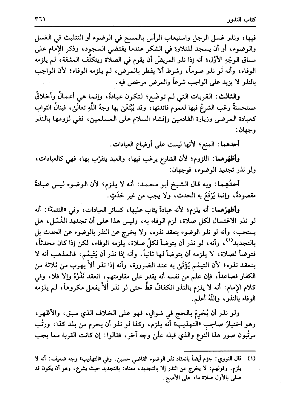 (¬1) قال النووي: جزم أيضاً بانعقاد نذر الوضوء القاضي حسين. وفي "التهذيب" وجه ضعيف: أنه لا يلزم. وقولهم: لا يخرج عن النذر إلا بالتجديد، معناه: بالتجديد حيث يشرع، وهو أن يكون قد صلى بالأول صلاة ما، على الأصح.