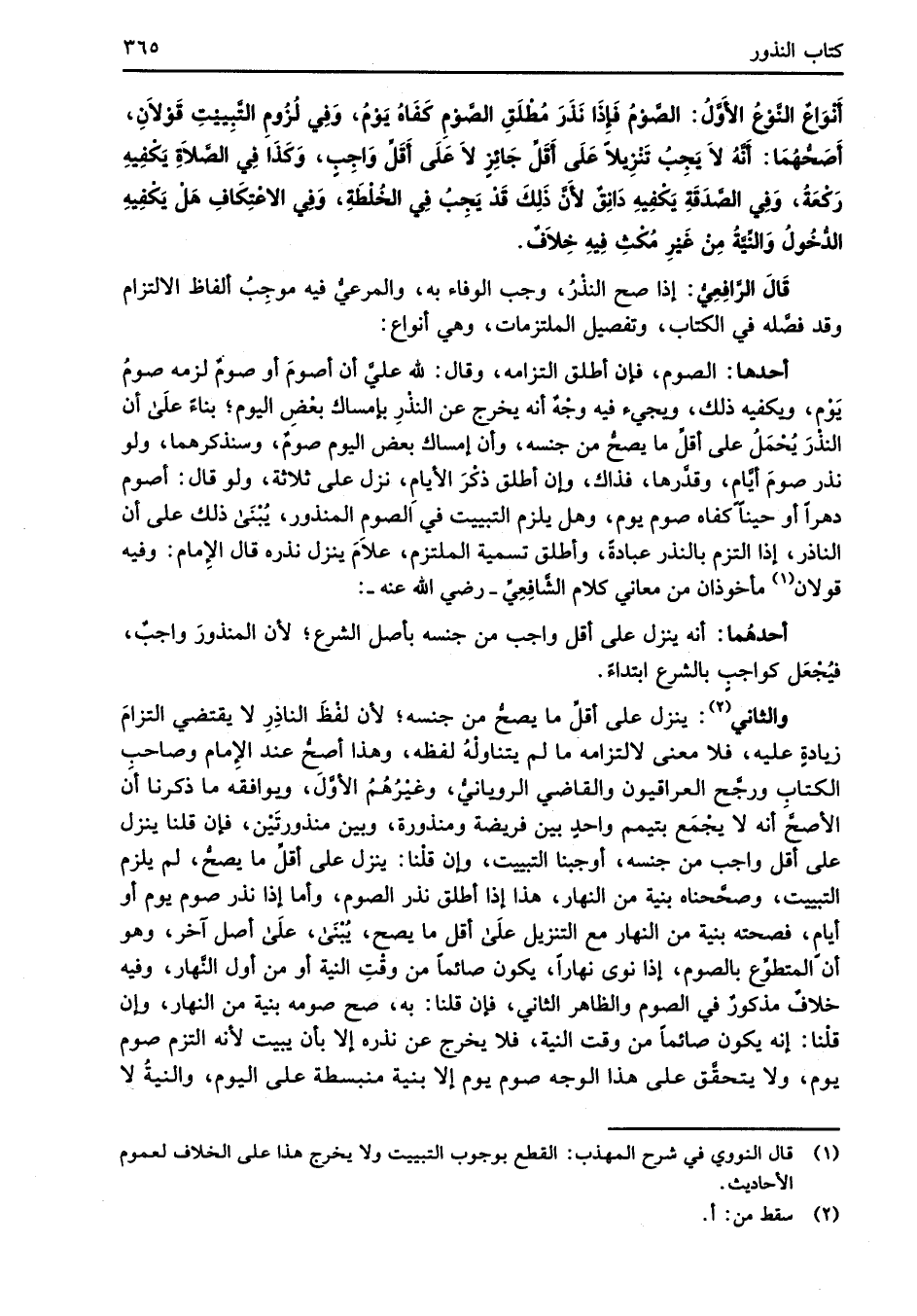 أَنْوَاعٌ النَّوْعُ الأَوَّلُ: الصَّوْمُ فَإذَا نَذَرَ مُطْلَقِ الصَّوْمِ كَفَاهُ يَوْمُ، وَفِي لُزُومِ التَّبِييْتِ قَوْلاَنِ، أَصَحُّهُمَا: أَنَّهُ لاَ يَجِبُ تَنْزِيلاً عَلَى أَقَلِّ جَائِزٍ لاَ عَلَى أَقَلِّ وَاجِبٍ، وَكَذَا فِي الصَّلاةِ يَكْفِيهِ رَكْعَةُ، وَفِي الصَّدقَةِ يَكْفِيهِ دَانِقٌ لأَنَّ ذَلِكَ قَدْ يَجِبُ فِي الخُلْطَةِ، وَفِي الاعْتِكَافِ هَلْ يَكْفِيهِ الدُّخُولُ وَالنِّيَّةُ مِنْ غَيْرِ مُكْثِ فِيهِ خِلاَفٌ.