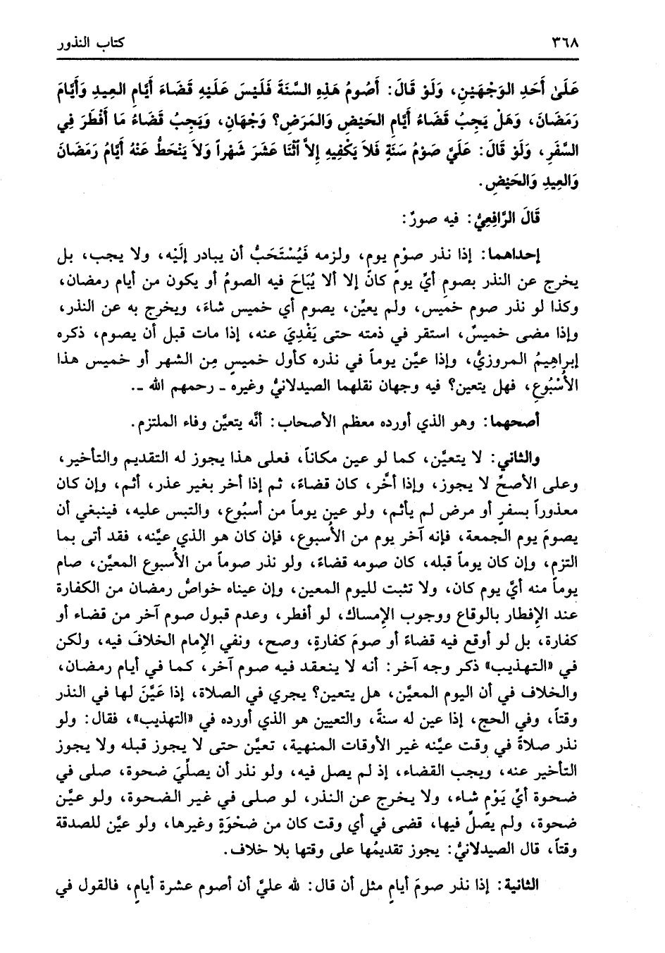 والثاني: لا يتعيَّن، كما لو عين مكاناً، فعلى هذا يجوز له التقديم والتأخير، وعلى الأصحِّ لا يجوز، وإذا أخَّر، كان قضاءً، ثم إذا أخر بغير عذر، أثم, وإن كان معذوراً بسفرٍ أو مرض لم يأثم, ولو عين يوماً من أسبُوع، والتبس عليه، فينبغي أن يصومَ يوم الجمعة، فإنه آخر يوم من الأُسبوع، فإن كان هو الذي عيَّنه، فقد أتى بما التزم، وإن كان يوماً قبله، كان صومه قضاءً، ولو نذر صوماً من الأُسبوع المعيَّن، صام يوماً منه أيَّ يوم كان، ولا تثبت لليوم المعين، وإن عيناه خواصُّ رمضان من الكفَّارة عند الإِفطار بالوقاع ووجوب الإِمساك، لو أفطر، وعدم قبول صوم آخر من قضاء أو كفارة، بل لو أوقع فيه قضاءً أوَ صومَ كفارةٍ، وصح، ونفي الإِمام الخلافَ فيه، ولكن في "التهذيب" ذكر وجه آخر: أنه لا ينعقد فيه صوم آخر، كما في أيام رمضان، والخلاف في أن اليوم المعيَّن، هل يتعين؟ يجري في الصلاة، إذا عَيَّنَ لها في النذر وقتاً، وفي الحج، إذا عين له سنةً، والتعيين هو الذي أورده في "التهذيب"، فقال: ولو نذر صلاةً في وقت عيَّنه غير الأوقات المنهية، تعيَّن حتى لا يجوز قبله ولا يجوز التأخير عنه، ويجب القضاء، إذ لم يصل فيه، ولو نذر أن يصلِّيَ ضحوة، صلى في ضحوة أيِّ يَوْمٍ شاء، ولا يخرج عن النذر، لو صلى في غير الضحوة، ولو عيَّن ضحوة، ولم يصلِّ فيها، قضى في أي وقت كان من ضحْوَةٍ وغيرها, ولو عيَّن للصدقة وقتاً، قال الصيدلانيُّ: يجوز تقديمُها على وقتها بلا خلاف.
