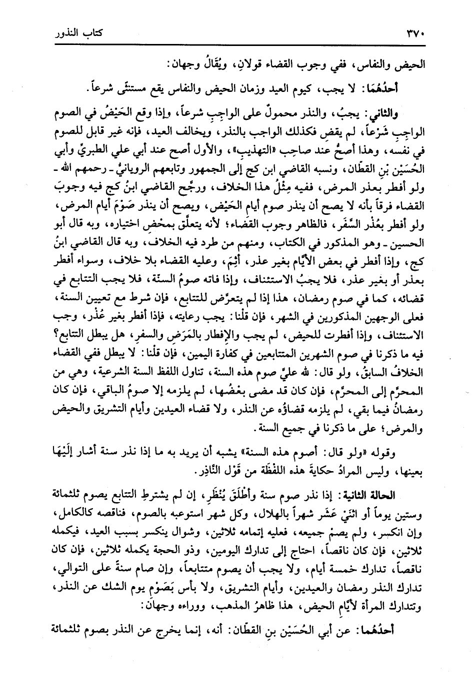 الحالة الثانية: إذا نذر صوم سنة وأطْلَقَ يُنْظَرِ، إن لم يشترطِ التتابع يصوم ثلثمائة وستين يوماً أو اثنَيْ عَشَر شهراً بالهلال، وكل شهر استوعبه بالصوم، فناقصه كالكامل، وإن انكسر، ولم يصمْ جميعه، فعليه إتمامه ثلاثين، وشوال ينكسر بسبب العيد، فيكمله ثلاثين، فإن كان ناقصاً، احتاج إلى تدارك اليومين، وذو الحجة يكمله ثلاثين، فإن كان ناقصاً، تدارك خمسة أيام، ولا يجب أن يصوم متتابعاً، وإن صام سنةً على التوالي، تدارك النذر رمضان والعيدين، وأيام التشريق، ولا بأس بَصَوْمِ يوم الشك عن النذر، وتتدارك المرأة لأيَّامِ الحيض، هذا ظاهرُ المذهب، ووراءه وجهان: