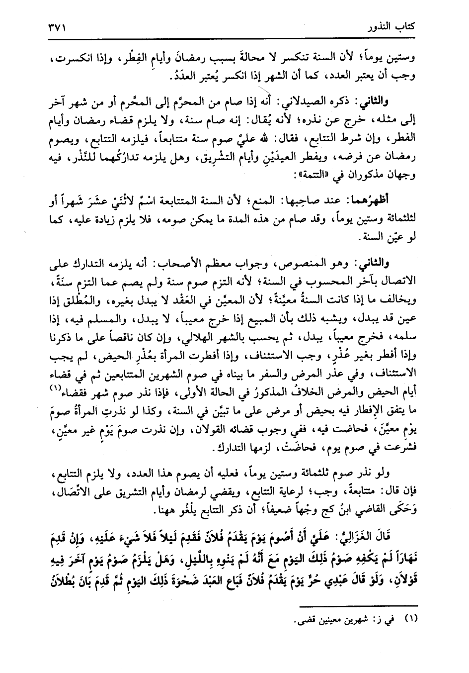 والثاني: ذكره الصيدلاني: أنه إذا صام من المحرَّم إلى المحرَّم أو من شهر آخر إلى مثله، خرج عن نذره؛ لأنه يُقال: إنه صام سنة، ولا يلزم قضاء رمضان وأيام الفطر، وإن شرط التتابع، فقال: لله عليَّ صوم سنة متتابعاً، فيلزمه التتابع، ويصوم رمضان عن فرضه، ويفطر العيدَيْنِ وأيام التشْرِيق، وهل يلزمه تدارُكُهما للنَّذْر، فيه وجهان مذكوران في "التتمة":