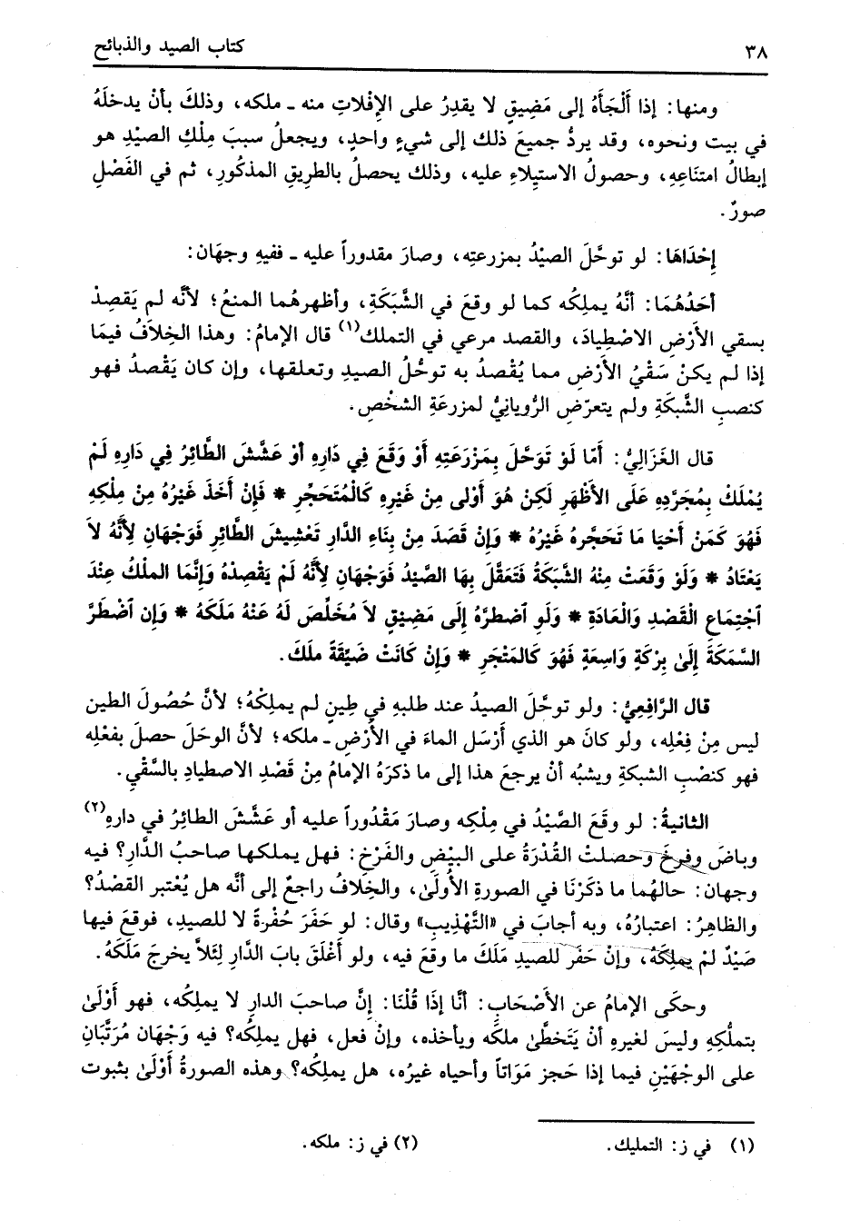 قال الغَزَالِيُّ: أمَّا لَوْ تَوَحَّلَ بِمَزْرَعَتِهِ أَوْ وَقَعَ فِي دَارِهِ أوْ عَشَّشَ الطَّائِرُ فِي دَارِهِ لَمْ يُمْلَكْ بِمُجَرَّدِهِ عَلَى الأَظْهَرِ لَكِنْ هُوَ أَوْلى مِنْ غَيْرِهِ كَالمُتَحَجِّرِ* فَإِنْ أَخَذَ غَيْرُهُ مِنْ مِلْكِهِ فَهوَ كَمَنْ أَحْيَا مَا تَحَجَّرهُ غَيْرُهُ* وَإِنْ قَصَدَ مِنْ بِنَاءِ الدَّارِ تَعْشِيشَ الطَّائِرِ فَوَجْهَانِ لِأَنَّهُ لاَ يَعْتَادُ* وَلَوْ وَقَعَتْ مِنْهُ الشَّبَكَةُ فَتَعَقَّلَ بِهَا الصَّيْدُ فَوَجْهَانِ لِأَنَّهُ لَمْ يَقْصِدْهُ وَإِنَّمَا الملْكُ عِنْدَ اجْتِمَاعِ القَصْدِ وَالْعَادةِ* وَلَوِ اضطرَّهُ إِلَى مَضِيقٍ لاَ مُخَلِّصَ لَهُ عَنْهُ مَلَكَهُ* وَإِن اضْطَرَّ السَّمَكَةَ إلى بِرْكةٍ وَاسِعَةٍ فَهُوَ كَالمَتْجَرِ* وإنْ كَانَتْ ضَيِّقَةً ملَكَ.