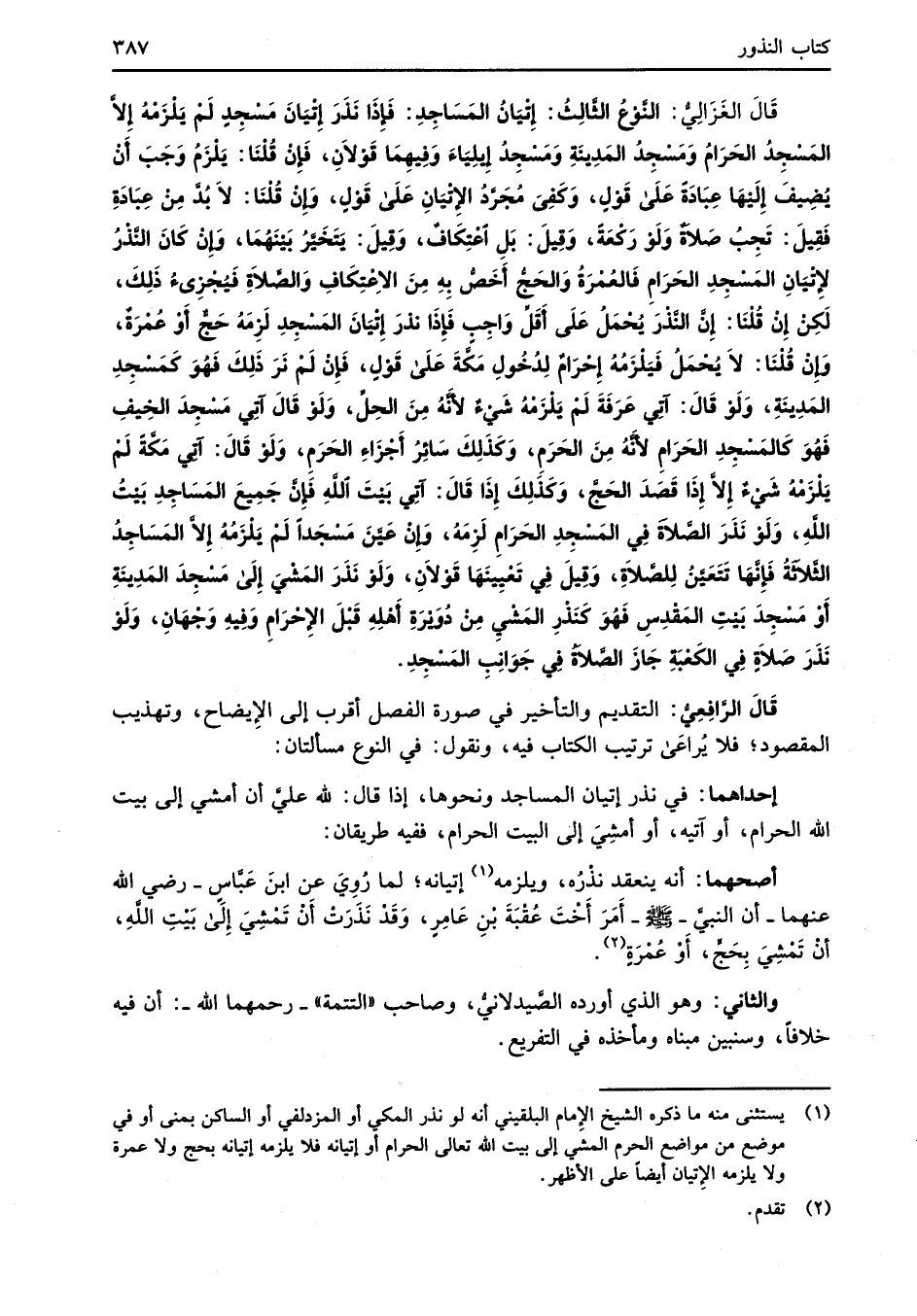 قَالَ الغَزَالِيُّ: النَّوْعُ الثَّالِثُ: إِتْيَانُ المَسَاجِدِ: فَإذَا نَذَرَ إِتْيَانَ مَسْجِدٍ لَمْ يَلْزَمهُ إِلاَّ المَسْجِدُ الحَرَامُ وَمَسْجِدُ المَدِينَةِ وَمَسْجِدُ إِيِلِيَاءَ وَفِيهِمَا قَوْلاَنِ، فَإنْ قُلْنَا: يَلْزَمُ وَجَبَ أَنْ يُضِيفَ إِلَيْهَا عِبَادَةً عَلَى قَوْلٍ، وَكَفِىَ مُجَرَّدُ الإِتْيَانِ عَلَى قَوْلٍ، وَإِنْ قلنَا: لاَ بُدَّ مِنْ عِبَادَةِ فَقِيلَ: تَجِبُ صَلاةٌ وَلَوْ رَكْعَةً، وَقِيلَ: بَلِ اعْتِكَافٌ، وَقِيلَ: يَتَخَيَّرُ بَيْنَهُمَا، وَإِنْ كَانَ النَّذْرُ لإِتْيَانِ المَسْجِدِ الحَرَامِ فَالعُمْرَةُ وَالحَجُّ أَخَصُّ بِهِ مِنَ الاعْتِكَافِ وَالصَّلاَةِ فَيُجْزِئُ ذَلِكَ، لَكِنْ إِنْ قُلْنَا: إِنَّ النَّذْرَ يُحْمَلُ عَلَى أَقَلِّ وَاجِبٍ فَإِذَا نذرَ إِتْيَانَ المَسْجِدِ لَزِمَهُ حَجٌّ أَوْ عُمْرَةٌ, وإنْ قُلْنَا: لاَ يُحْمَلُ فَيَلْزَمُهُ إِحْرَامٌ لِدُخُولِ مَكَّةَ عَلَى قَوْلٍ، فَإنْ لَمْ نَرَ ذَلِكَ فَهُوَ كَمَسْجِدِ المَدِينَةِ، وَلَوْ قَالَ: آتِي عَرَفَةَ لَمْ يَلْزَمُهُ شَيْءٌ لأَنَّهُ مِنَ الحِلِّ، وَلَوْ قَالَ آتِي مَسْجِدَ الخِيفِ فَهُوَ كَالمَسْجِدِ الحَرَامِ لأَنَّهُ مِنَ الحَرَمِ، وَكَذَلِكَ سَائِرُ أَجْزَاءِ الحَرَمِ، وَلَوْ قَالَ: آتِي مَكَّةً لَمْ يَلْزَمُهُ شَىْءٌ إِلاَّ إِذَا قَصَدَ الحَجَّ، وَكَذَلِكَ إِذَا قَالَ: آتِي بَيْتَ اللهِ فَإِنَّ جَمِيعَ المَسَاجِدِ بَيْتُ اللهِ، وَلَوْ نَذَرَ الصَّلاةَ فِي المَسْجِدِ الحَرَامِ لَزِمَهُ، وَإِنْ عَيَّنَ مَسْجَداً لَمْ يَلْزَمُهُ إِلا المَسَاجِدُ الثَّلاثةُ فَإِنَّهَا تَتَعَيَّنُ لِلصَّلاَةِ، وَقِيلَ في تَعْيِينَهَا قَوْلاَنِ، وَلَوْ نَذَرَ المَشْيَ إلى مَسْجِدَ المَدِينَةِ أَوْ مَسْجِدَ بَيْتِ المَقْدِسِ فَهُوَ كَنَذْرِ المَشْيِ مِنْ دُوَيْرَةِ أهْلِهِ قَبلَ الإِحْرَامِ وَفِيهِ وَجْهَانِ، وَلَوْ نَذَرَ صَلاَةٍ في الكَعْبَةِ جَازَ الصَّلاةُ فِي جَوَانِبِ المَسْجِدِ.