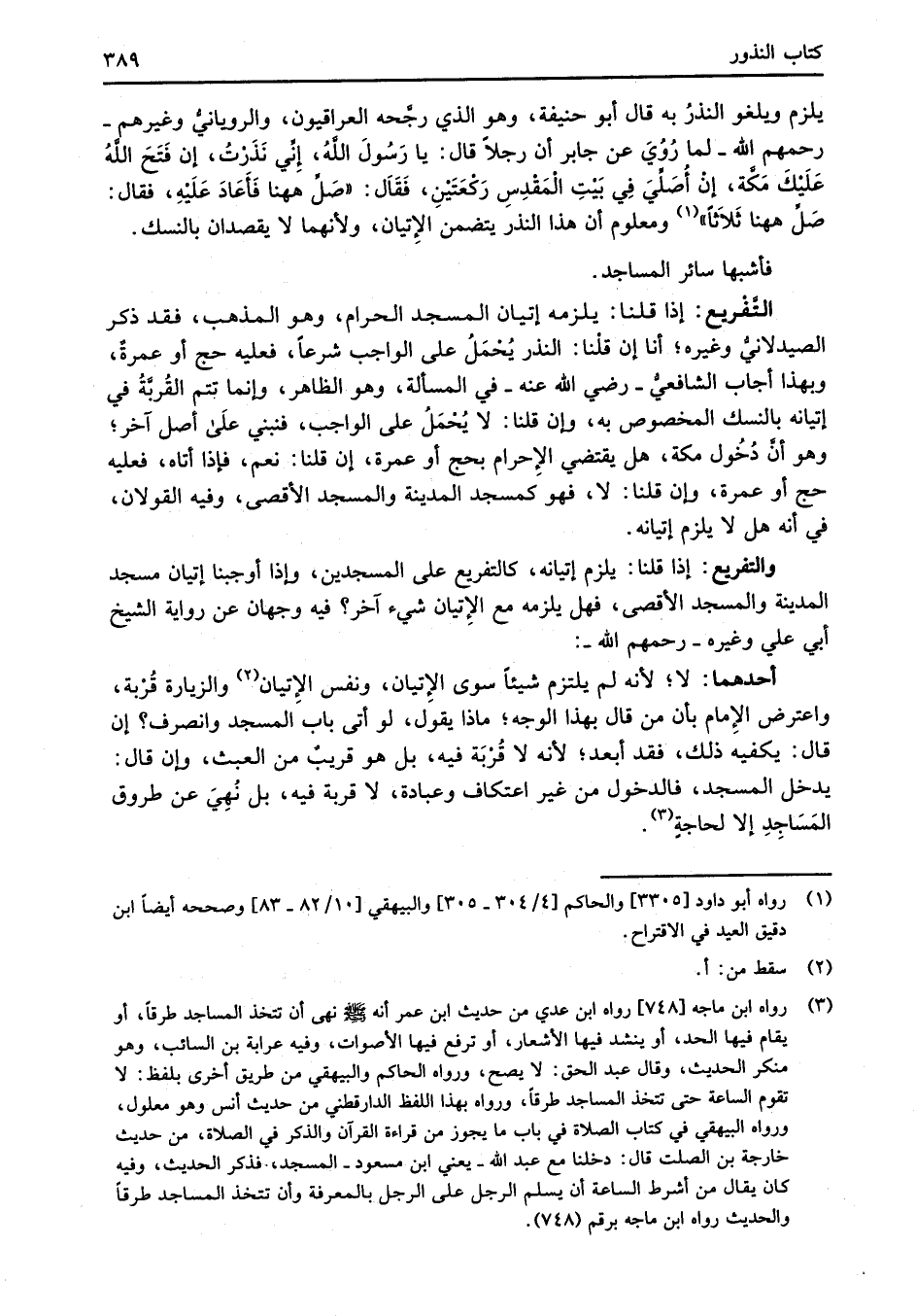 يلزم ويلغو النذرُ به قال أبو حنيفة، وهو الذي رجَّحه العراقيون، والرويانيُّ وغيرهم -رحمهم الله- لما رُوُيَ عن جابر أن رجلاً قال: يا رَسُولَ اللهُ، إِنِّي نَذَرْتُ، إن فَتَحَ اللهُ عَلَيْكَ مَكَّة، إنْ أُصَلِّيَ فِي بَيْتِ الْمَقْدِسِ رَكْعَتَيْنِ، فَقَاَل: "صَلِّ هاهنا فَأَعَادَ عَلَيْهِ، فقال: صَلِّ هاهنا ثَلاَثاً" (¬1) ومعلوم أن هذا النذر يتضمن الإِتيان، ولأنهما لا يقصدان بالنسك.