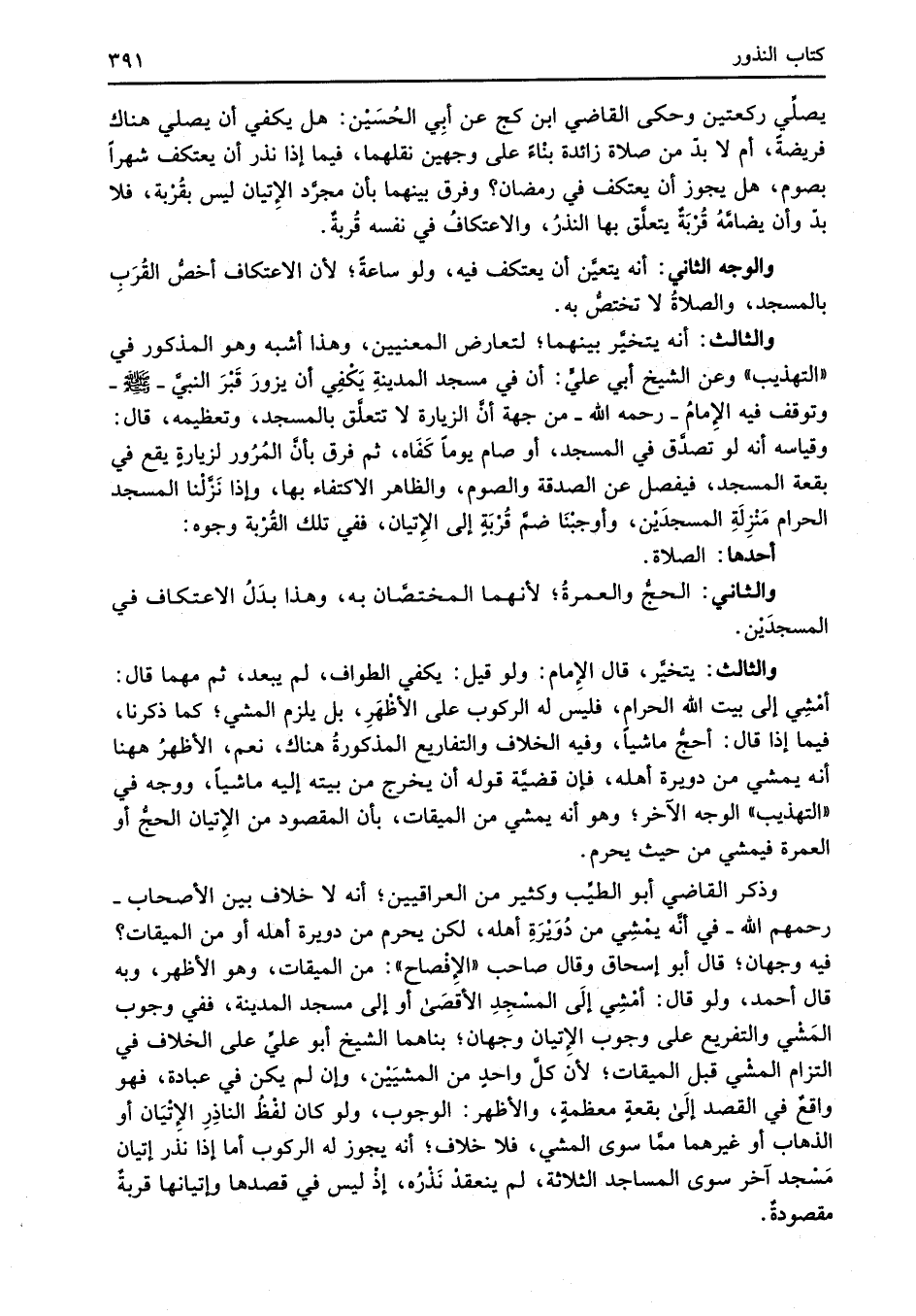 والثالث: أنه يتخيَّر بينهما؛ لتعارض المعنيين، وهذا أشبه وهو المذكور في "التهذيب" وعن الشيخ أبي عليٍّ: أن في مسجد المدينةِ يَكفِي أن يزورَ قَبْرَ النبيَّ -صلى الله عليه وسلم- وتوقف فيه الإِمامُ -رحمه الله- من جهة أنَّ الزيارة لا تتعلَّق بالمسجد، وتعظيمه، قال: وقياسه أنه لو تصدَّق في المسجد، أو صام يوماً كَفَاه، ثم فرق بأنَّ المُرُور لزيارةٍ يقع في بقعة المسجد، فيفصل عن الصدقة والصوم، والظاهر الاكتفاء بها، وإذا نَزَّلْنا المسجد الحرام مَنْزِلَةِ المسجدَيْن، وأوجبْنَا ضمَّ قُرْبَةٍ إلى الإِتيان، ففي تلك القُرْبة وجوه: