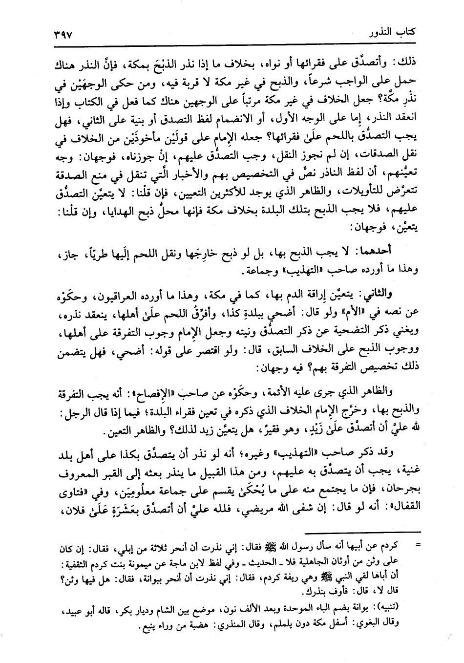 ذلك: وأتصدَّق على فقرائها أو نواه، بخلاف ما إذا نذر الذبْحَ بمكة، فإنَّ النذر هناك حمل على الواجب شرعاً، والذبح في غير مكة لا قربة فيه، ومن حكى الوجهَيْن في نذْرِ مكَّة؟ جعل الخلاف في غير مكة مرتباً على الوجهين هناك كما فعل في الكتاب وإذا انعقد النذر، إِما على الوجه الأول، أو الانضمام لفظ التصدق أو بنية على الثاني، فهل يجب التصدُّق باللحم عَلَى فقرائها؟ جعله الإِمام على قولَيْن مأخوذَيْن من الخلاف في نقل الصدقات، إن لم نجوز النقل، وجب التصدُّق عليهم، إنْ جوزناه، فوجهان: وجه تعيُّنهم، أن لفظ الناذر نصٌّ في التخصيص بهم والأخبار الَّتي تنقل في منع الصدقة تتعرَّض للتاويلات، والظاهر الذي يوجد للأكثرين التعيين، فإن قلْنا: لا يتعيَّن التصدُّق عليهم، فلا يجب الذبح بتلك البلدة بخلاف مكة فإنها محلُّ ذبح الهدايا، وإن قلْنا: يتعيَّن، فوجهان: