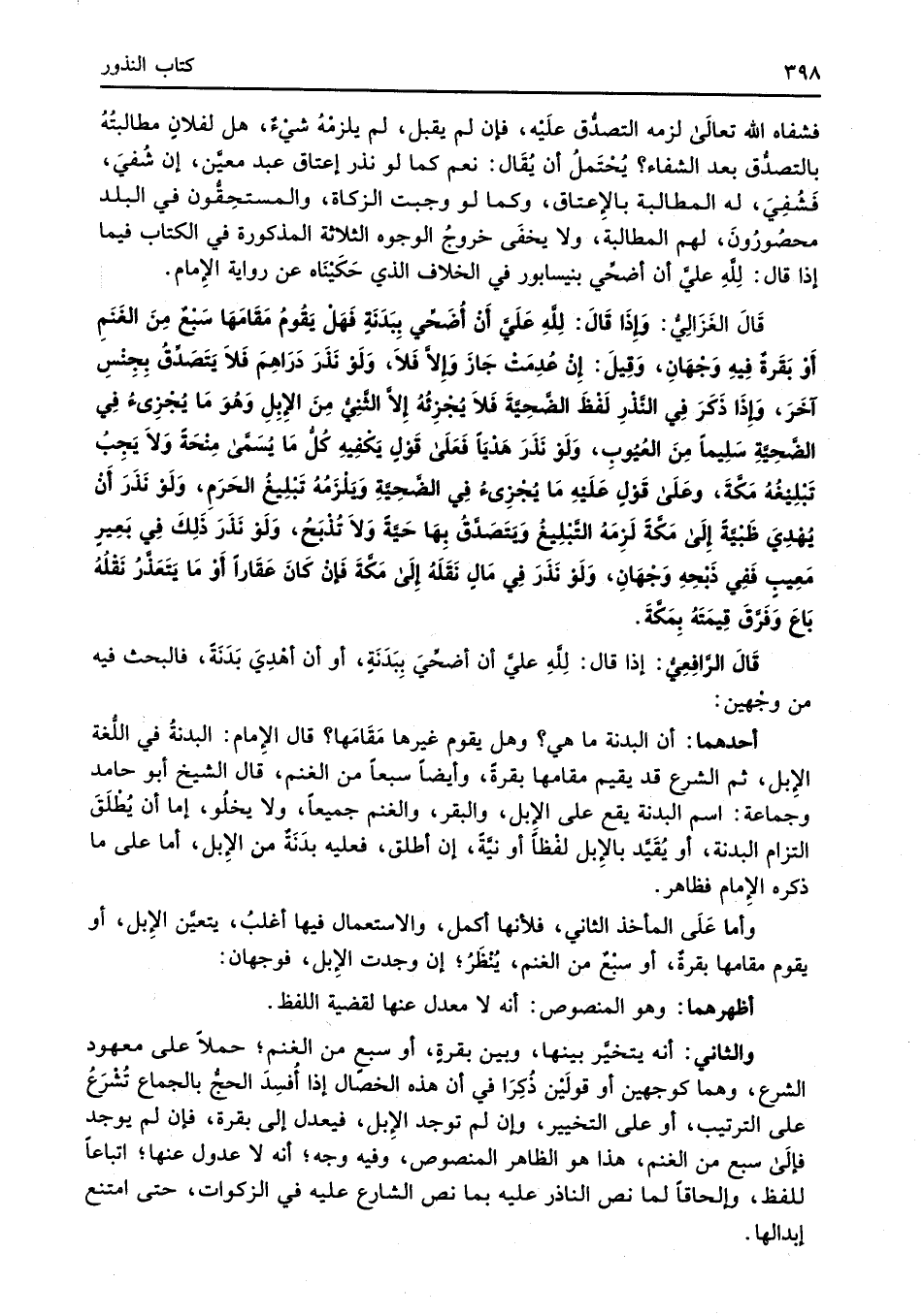 قَالَ الغَزَالِيُّ: وَإِذَا قَالَ: للهِ عَلَيَّ أَنْ أُضَحِّي بِبَدَنَةٍ فَهَلْ يَقُومُ مَقَامَهَا سَبْعٌ مِنَ الغَنَمِ أَوْ بَقَرةٌ فِيهِ وَجْهَانِ، وَقِيلَ: إِنْ عُدِمَتْ جَازَ وَإِلاَّ فلاَ، وَلَوْ نَذَرَ دَرَاهِمَ فلاَ يَتَصَدَّقُ بِجِنْسِ آخَرَ، وَإذَا ذَكَرَ فِي النَّذْرِ لَفْظَ الضَّحِيَّةَ فَلاَ يُجْزِئُهُ إلا الثَّنِيُّ مِنَ الإِبِلِ وَهُوَ مَا يُجْزِئُ فِي الضَّحِيَّةِ سَلِيماً مِنَ العُيُوبِ، وَلَوْ نَذَرَ هَدْيَاً فَعَلَى قَوْلٍ يَكْفِيهِ كُلُّ مَا يُسَمَّى مِنْحَةً وَلاَ يَجِبُ تَبْلِيْغُهُ مَكَّةَ، وعَلَى قَوْلٍ عَلَيْهِ مَا يُجْزِئُ فِي الضَّحِيَّةِ وَيَلْزَمُهُ تَبلِيغُ الحَرَمِ، وَلَوْ نَذَرَ أَنْ بُهْدِيَ ظَبيَّةً إِلَى مَكَّةً لَزِمَهُ التَّبْلِيغُ وَيَتَصَدَّقُ بِهَا حَيَّةً وَلاَ تُذْبَحُ، وَلَوْ نَذَرَ ذَلِكَ فِي بَعِيرٍ مَعِيبٍ فَفِي ذَبْحِهِ وَجْهَانِ، وَلَوْ نَذَرَ فِي مَالٍ نَقَلَهُ إِلَى مَكَّةَ فَإِنْ كَانَ عَقَاراً أَوْ مَا يَتَعَذَّرُ نَقْلُهُ بَاعَ وَفَرَّقَ قِيمَتَهُ بِمَكَّةَ.
