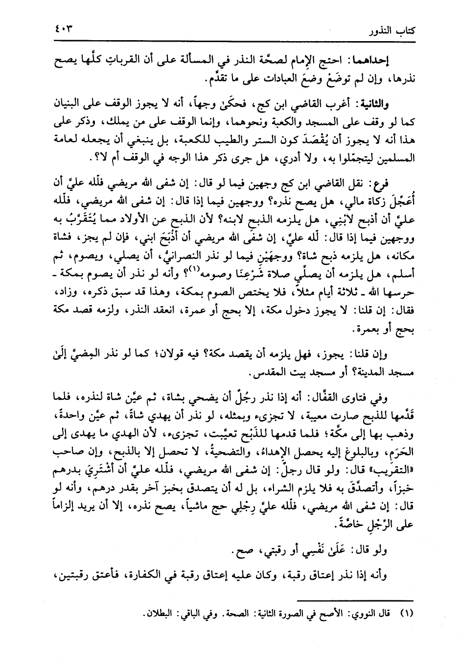 إحداهما: احتج الإِمام لصحَّة النذر في المسألة على أن القرباتِ كلَّها يصح نذرها، وإن لم توضَعْ وضعَ العبادات على ما تقدَّم.