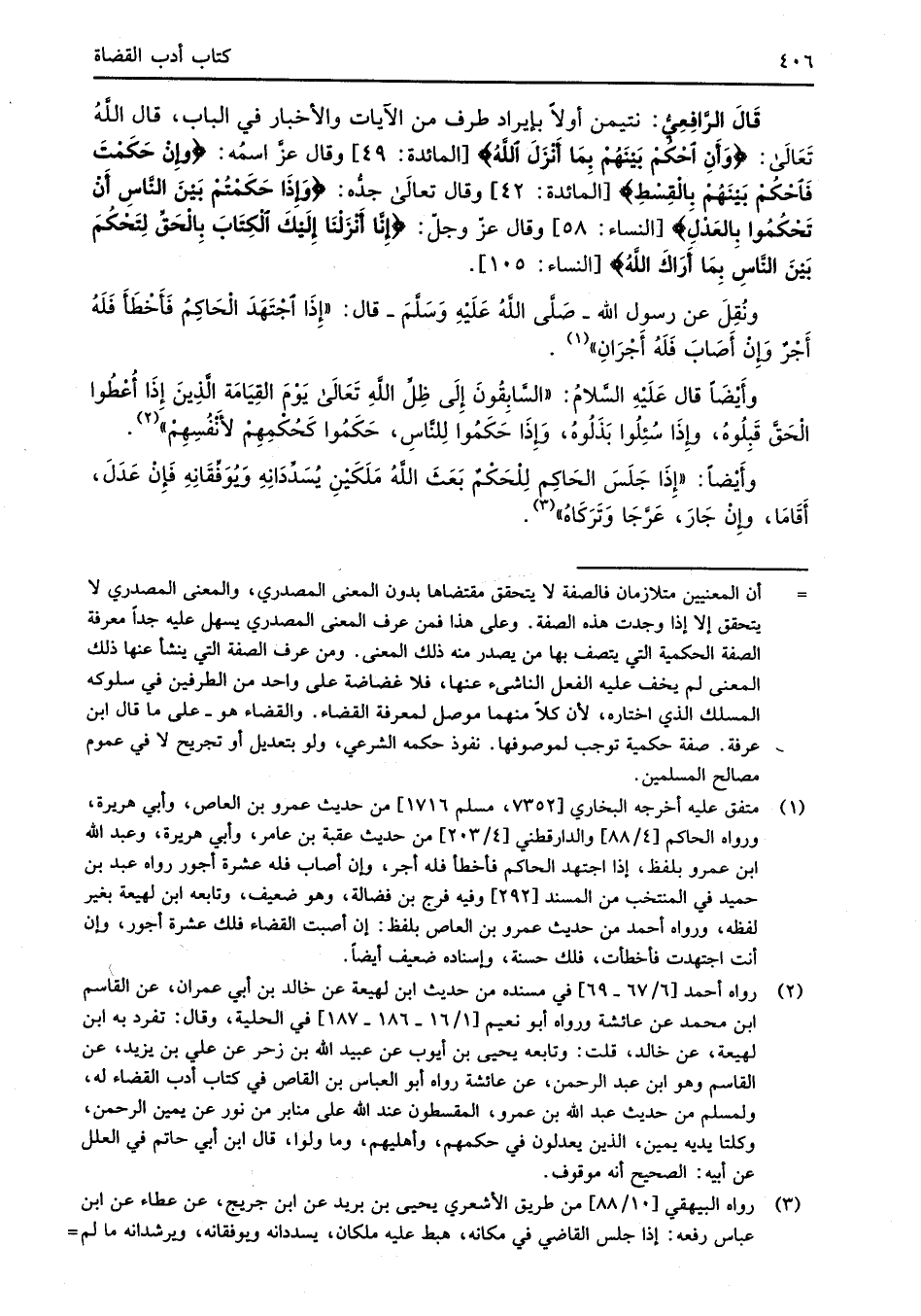 قَالَ الرَّافِعِيُّ: نتيمن أولاً بإيراد طرف من الآيات والأخبار في الباب، قال اللهُ تَعَالَى: {وَأَنِ احْكُمْ بَيْنَهُمْ بِمَا أَنْزَلَ اللَّهُ} [المائدة: 49] وقال عزَّ اسمُه: {وَإِنْ حَكَمْتَ فَاحْكُمْ بَيْنَهُمْ بِالْقِسْطِ} [المائدة: 42] وقال تعالَى جدُّه: {وَإِذَا حَكَمْتُمْ بَيْنَ النَّاسِ أَنْ تَحْكُمُوا بِالْعَدْلِ} [النساء: 58] وقال عَزَّ وَجَلَّ: {إِنَّا أَنْزَلْنَا إِلَيْكَ الْكِتَابَ بِالْحَقِّ لِتَحْكُمَ بَيْنَ النَّاسِ بِمَا أَرَاكَ اللَّهُ} [النساء: 105].