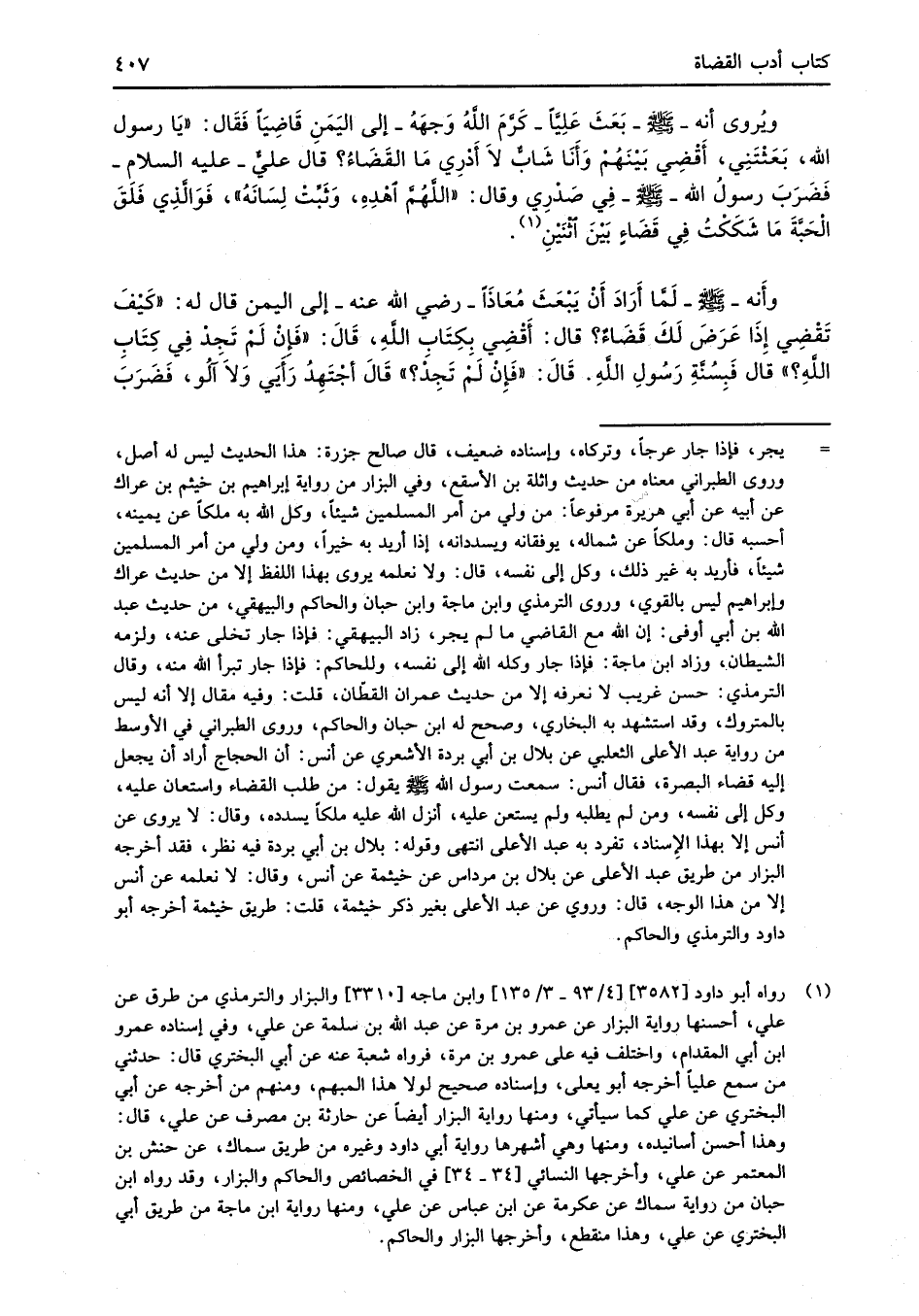وأَنه -صلى الله عليه وسلم- لَمَّا أَرَادَ أَنْ يَبْعَثَ مُعَاذَاً -رضي الله عنه- إلى اليمن قال له: "كَيْفَ تَقْضِي إِذَا عَرَضَ لَكَ قَضَاءٌ؟؛ قال: أَقْضِي بكِتَابِ اللهِ، قَالَ: "فَإِنْ لَمْ تَجِدْ فِي كِتَابِ اللهِ؟ " قال فَبِسُنَّةِ رَسُولِ اللهِ. قَالَ: "فَإِنْ لَمْ تَجِدْ؟ " قَالَ أجْتَهِدُ رَأَيَي وَلاَ آلُو، فَضَرَبَ