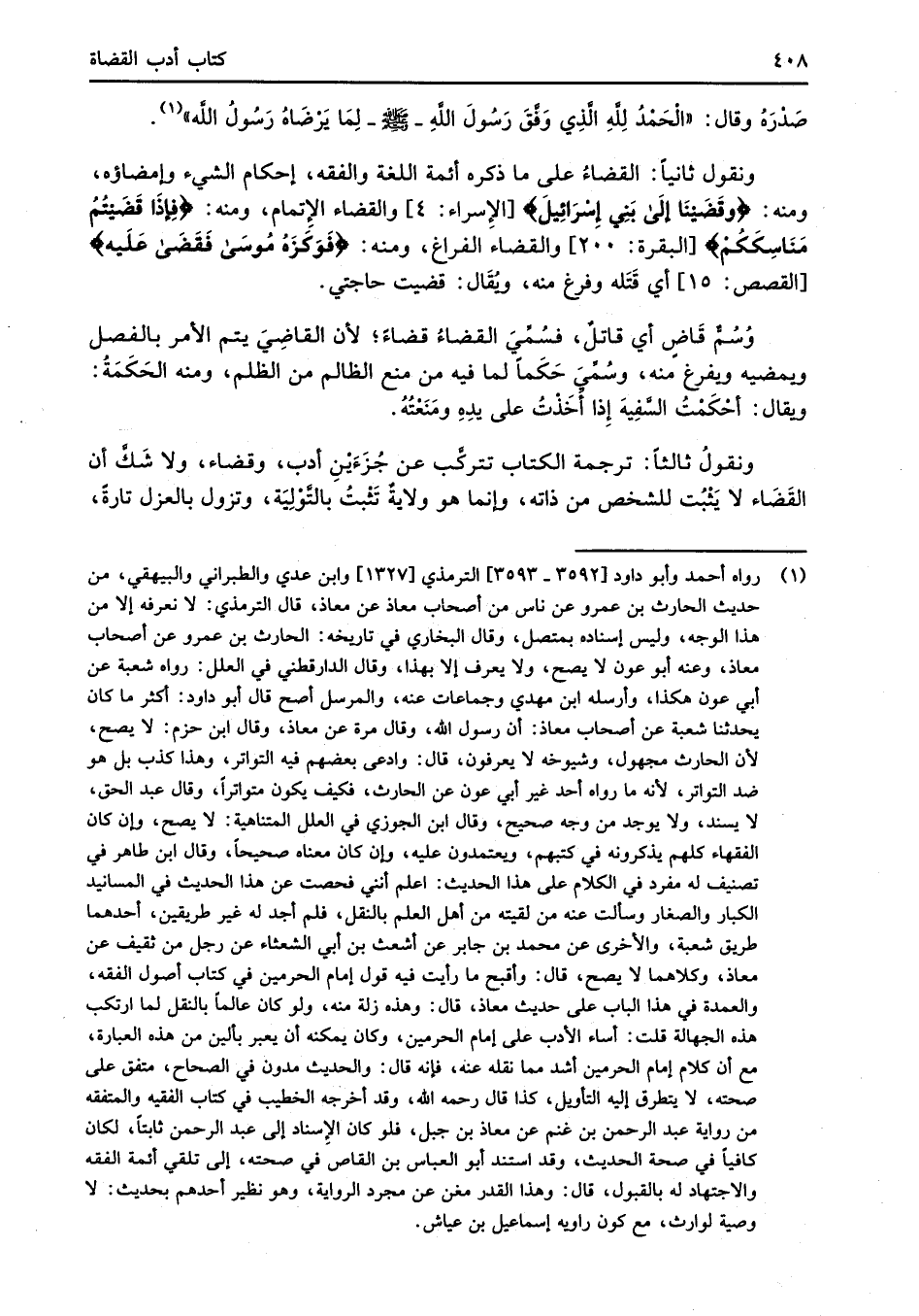 (¬1) رواه أحمد وأبو داود [3592 - 3593] الترمذي [1327] وابن عدي والطبراني والبيهقي، من حديث الحارث بن عمرو عن ناس من أصحاب معاذ عن معاذ، قال الترمذي: لا نعرفه إلا من هذا الوجه، وليس إسناده بمتصل، وقال البخاري في تاريخه: الحارث بن عمرو عن أصحاب معاذ، وعنه أبو عون لا يصح، ولا يعرف إلا بهذا، وقال الدارقطني في العلل: رواه شعبة عن أبي عون هكذا، وأرسله ابن مهدي وجماعات عنه، والمرسل أصح قال أبو داود: أكثر ما كان يحدثنا شعبة عن أصحاب معاذ: أن رسول الله، وقال مرة عن معاذ، وقال ابن حزم: لا يصح، لأن الحارث مجهول، وشيوخه لا يعرفون، قال: وادعى بعضهم فيه التواتر، وهذا كذب بل هو ضد التواتر؛ لأنه ما رواه أحد غير أبي عون عن الحارث، فكيف يكون متواتراً، وقال عبد الحق، لا يسند، ولا يوجد من وجه صحيح، وقال ابن الجوزي في العلل المتناهية: لا يصح، وإن كان الفقهاء كلهم يذكرونه في كتبهم، ويعتمدون عليه، وإن كان معناه صحيحاً، وقال ابن طاهر في تصنيف له مفرد في الكلام على هذا الحديث: اعلم أنني فحصت عن هذا الحديث في المسانيد الكبار والصغار وسألت عنه من لقيته من أهل العلم بالنقل، فلم أجد له غير طريقين، أحدهما طريق شعبة، والأخرى عن محمد بن جابر عن أشعث بن أبي الشعثاء عن رجل من ثقيف عن معاذ، وكلاهما لا يصح، قال: وأقبح ما رأيت فيه قول إمام الحرمين في كتاب أصول الفقه، والعمدة في هذا الباب على حديث معاذ، قال: وهذه زلة منه، ولو كان عالماً بالنقل لما ارتكب هذه الجهالة قلت: أساء الأدب على إمام الحرمين، وكان يمكنه أن يعبر بألين من هذه العبارة، مع أن كلام إمام الحرمين أشد مما نقله عنه، فإنَّه قال: والحديث مدون في الصحاح، متفق على صحته، لا يتطرق إليه التأويل، كذا قال رحمه الله، وقد أخرجه الخطيب في كتاب الفقيه والمتفقه من رواية عبد الرحمن بن غنم عن معاذ بن جبل، فلو كان الإِسناد إلى عبد الرحمن ثابتاً، لكان كافياً في صحة الحديث، وقد استند أبو العباس بن القاص في صحته، إلى تلقي أئمة الفقه والاجتهاد له بالقبول، قال: وهذا القدر مغن عن مجرد الرواية، وهو نظير أحدهم بحديث: لا وصية لوارث، مع كون راويه إسماعيل بن عياش.