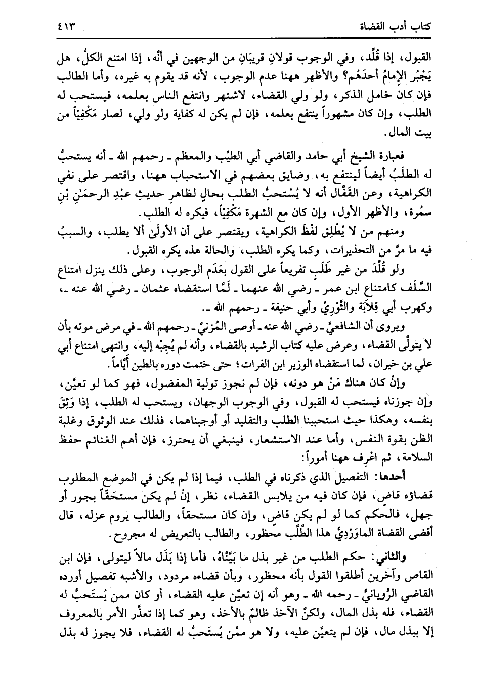 ولو قُلِّدَ من غير طَلَبٍ تفريعاً على القول بعَدَم الوجوب، وعلى ذلك ينزل امتناع السَّلَف كامتناع ابن عمر -رضي الله عنهما- لَمَّا استقضاه عثمان -رضي الله عنه-، وكهرب أبي قِلاَبَة والثَّوْرِيِّ وأبي حنيفة -رحمهم الله-.