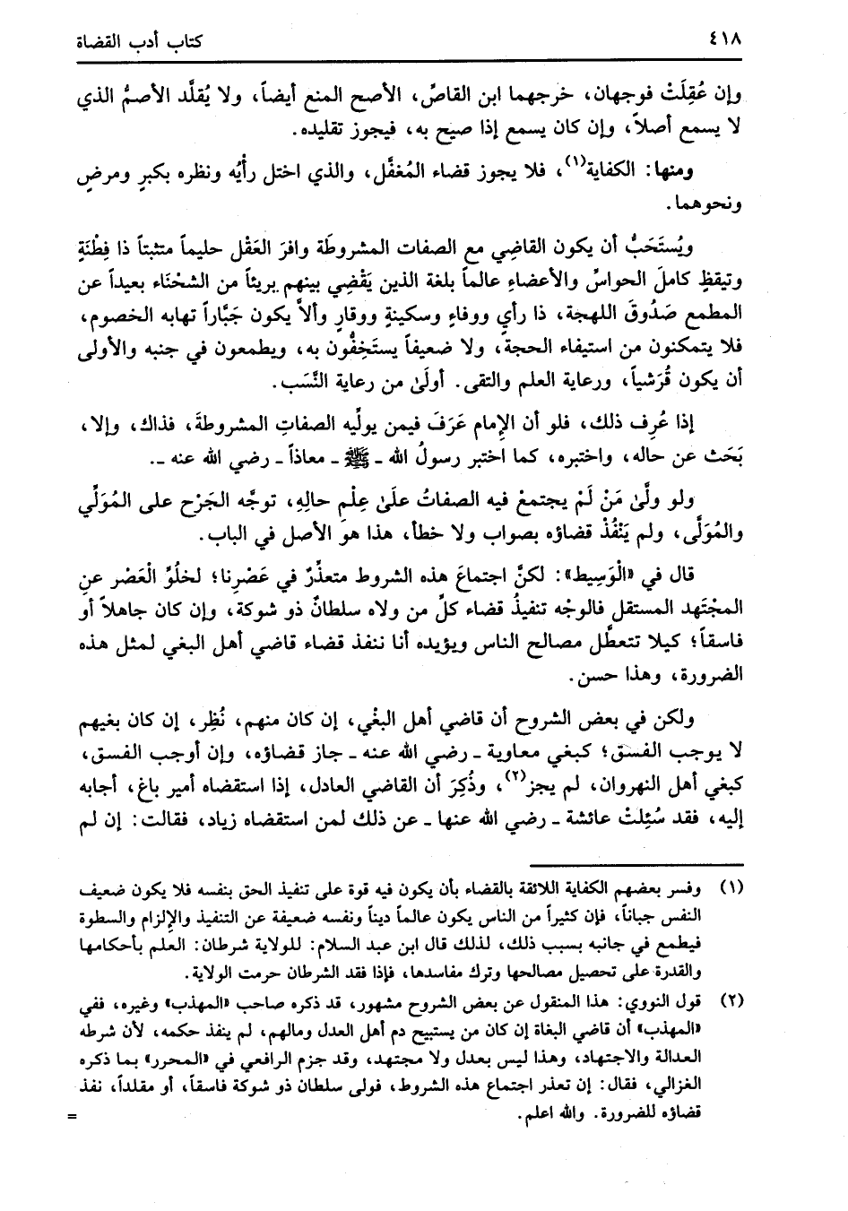 (¬2) قول النووي: هذا المنقول عن بعض الشروح مشهور، قد ذكره صاحب "المهذب" وغيره، ففي "المهذب" أن قاضي البغاة إن كان من يستبح دم أهل العدل ومالهم، لم ينفذ حكمه, لأن شرطه العدالة والاجتهاد، وهذا ليس بعدل ولا مجتهد، وقد جزم الرافعي في "المحرر" بما ذكره الغزالي، فقال: إن تعذر اجتماع هذه الشروط، فولى سلطان ذو شوكة فاسقاً، أو مقلداً، نفذ قضاؤه للضرورة. والله اعلم. =
