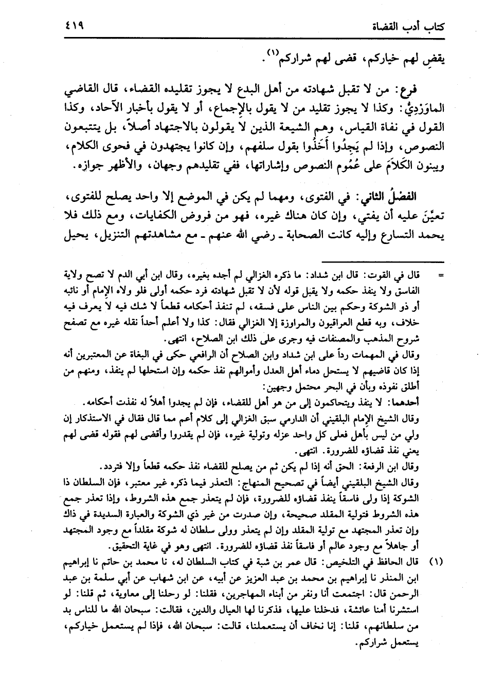 الفصْلُ الثاني: في الفتوى، ومهما لم يكن في الموضع إلا واحد يصلح للفتوى، تعيَّنَ عليه أن يفتي، وإن كان هناك غيره، فهو من فروض الكفايات، ومع ذلك فلا يحمد التسارع وإليه كانت الصحابة -رضي الله عنهم- مع مشاهدتهم التنزيل، يحيل