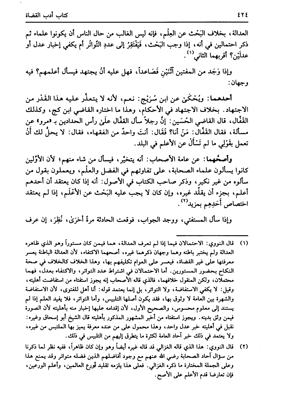 (¬1) قال النووي: الاحتمالان فيما إذا لم تعرف العدالة، هما فيمن كان مستوراً وهو الذي ظاهره العدالة ولم يختبر باطنه وهما وجهان ذكرهما غيره، أصحهما الاكتفاء، لأن العدالة الباطنة يعسر معرفتها على غير القضاة، فيعسر على العوام تكليفهم بها، وهذا الخلاف كالخلاف في صحة النكاح بحضور المستورين. أما الاحتمالان في اشتراط عدد التواتر، والاكتفاء بعدل، فهما محتملان، ولكن المنقول خلافهما، فالذي قاله الأصحاب إنه يجوز استفتاء من استفاضت أهليته، وقيل: لا يكفي الاستفاضة، ولا التواتر، بل انما يعتمد قوله: أنا أهل للفتوى، لأن الاستفاضة والشهرة بين العامة لا وثوق بها، فقد يكون أصلها التلبيس، وأما التواتر، فلا يفيد العلم إذا لم يستند إلى معلوم محسوس، والصحيح الأول، لأن إقدامه عليها إخبار منه بأهليته لأن الصورة فيمن وثق بدينه. ويجوز استفتاء من أخبر المشهور المذكور بأهليته قال الشيخ أبو إسحاق وغيره: نقبل في أهليته خبر عدل واحد، وهذا محمول على من عنده معرفة يميز بها الملتبس من غيره، ولا يعتمد في ذلك خبر آحاد العامة لكثرة ما يتطرق إليهم من التلبيس في ذلك.