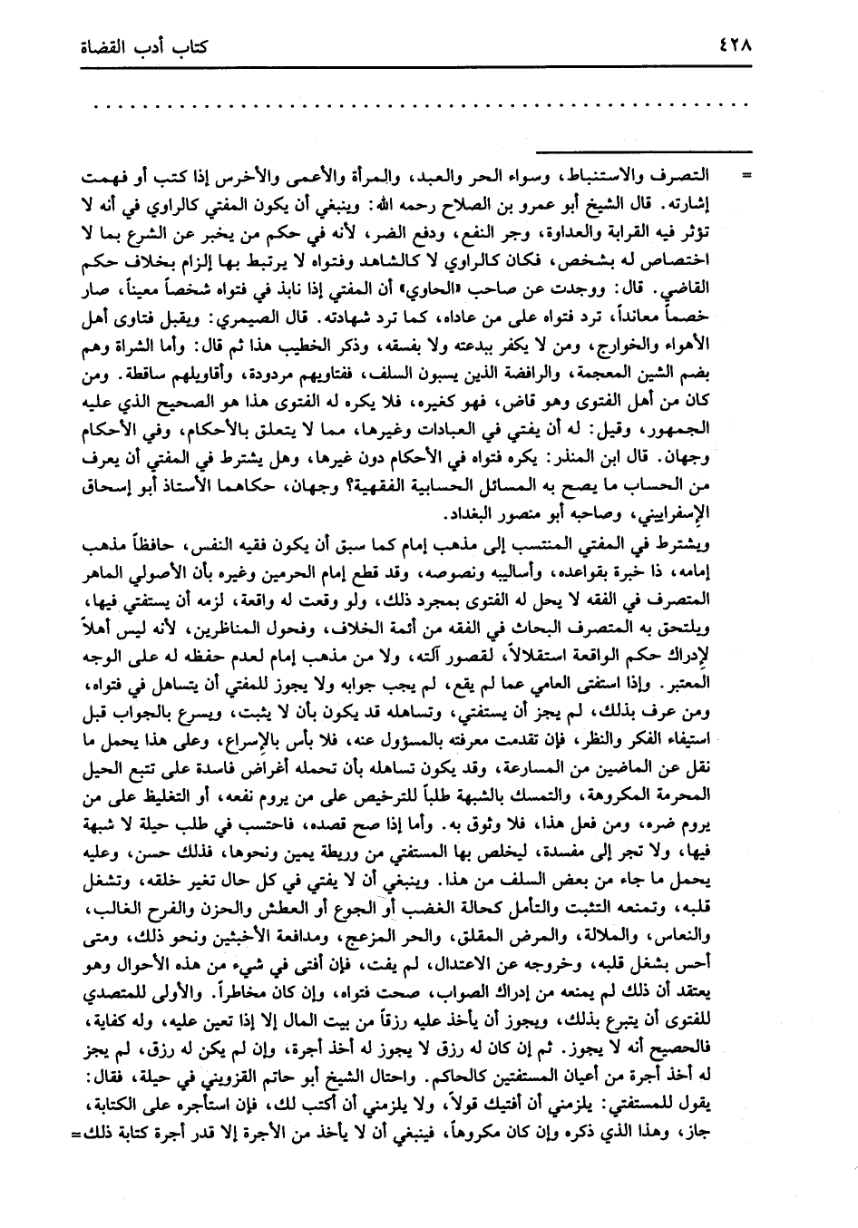 = التصرف والاستنباط، وسواء الحر والعبد، والمرأة والأعمى والأخرس إذا كتب أو فهمت إشارته. قال الشيخ أبو عمرو بن الصلاح رحمه الله: وينبغي أن يكون المفتي كالراوي في أنه لا تؤثر فيه القرابة والعداوة، وجر النفع، ودفع الضر؛ لأنه في حكم من يخبر عن الشرع بما لا اختصاص له بشخص، فكان كالراوي لا كالشاهد وفتواه لا يرتبط بها إلزام بخلاف حكم القاضي. قال: ووجدت عن صاحب "الحاوي" أن المفتي إذا نابذ في فتواه شخصاً معيناً، صار خصماً معانداً، ترد فتواه على من عاداه، أما ترد شهادته. قال الصيمري: ويقبل فتاوى أهل الأهواء والخوارج، ومن لا يكفر ببدعته ولا بفسقه، وذكر الخطيب هذا ثم قال: وأما الشراة وهم بضم الشين المعجمة، والرافضة الذين يسبون السلف، ففتاويهم مردودة، وأقاويلهم ساقطة. ومن كان من أهل الفتوى وهو قاض، فهو كغيره، فلا يكره له الفتوى هذا هو الصحيح الذي عليه الجمهور، وقيل: له أن يفتي في العبادات وغيرها، مما لا يتعلق بالأحكام، وفي الأحكام وجهان. قال ابن المنذر: يكره فتراه في الأحكام دون غيرها، وهل يشترط في المفتي أن يعرف من الحساب ما يصح به المسائل الحسابية الفقهية؟ وجهان، حكاهما الأستاذ أبو إسحاق الإِسفراييني، وصاحبه أبو منصور البغداد.