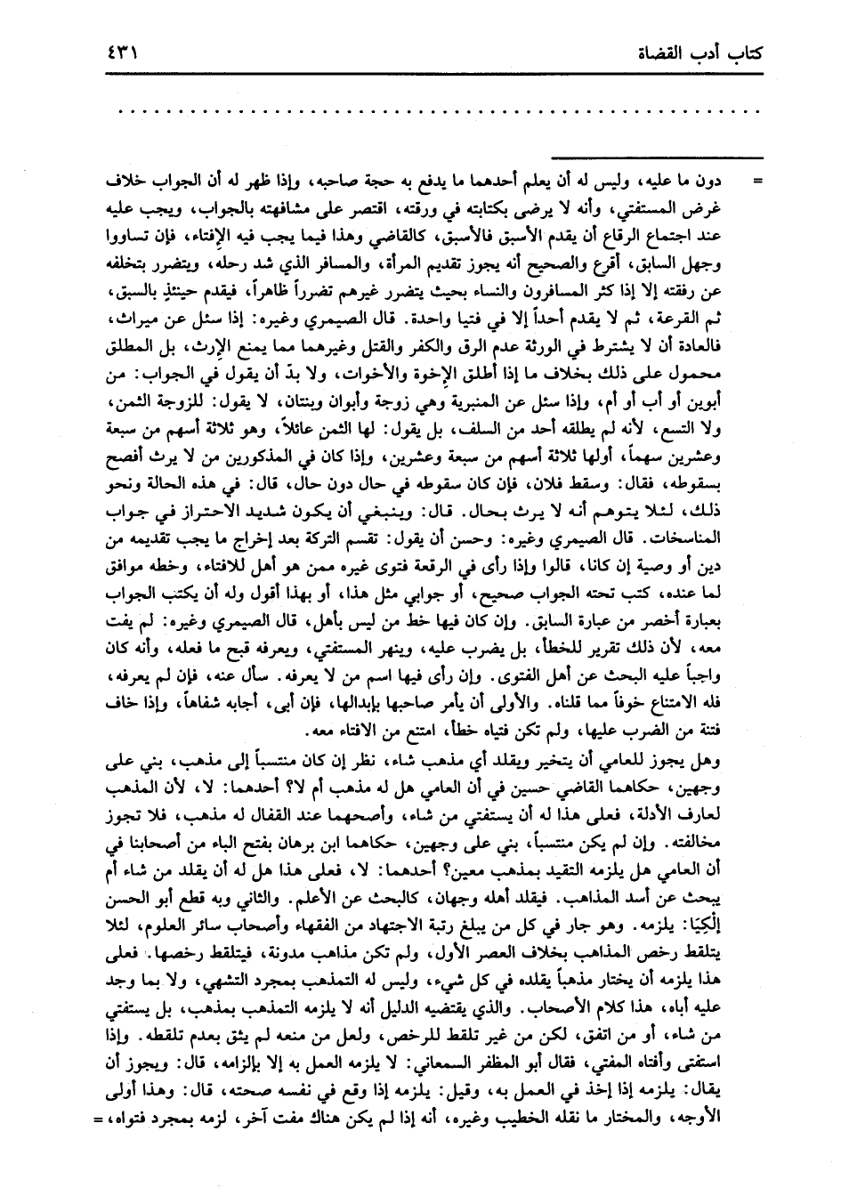 = دون ما عليه، وليس له أن يعلم أحدهما ما يدفع به حجة صاحبه، وإذا ظهر له أن الجواب خلاف غرض المستفتي، وأنه لا يرضى بكتابته في ورقته، اقتصر على مشافهته بالجواب، ويجب عليه عند اجتماع الرقاع أن يقدم الأسبق فالأسبق، كالقاضي وهذا فيما يجب فيه الإِفتاء، فإن تساووا وجهل السابق، أقرع والصحيح أنه يجوز تقديم المرأة، والمسافر الذي شد رحله، ويتضرر بتخلفه عن رفقته إلا إذا كثر المسافرون والنساء بحيث يتضرر غيرهم تضرراً ظاهراً، فيقدم حينئذٍ بالسبق، ثم القرعة، ثم لا يقدم أحداً إلا في فتيا واحدة. قال الصيمري وكمِره: إذا سئل عن ميراث، فالعادة أن لا يشترط في الورثة عدم الرق والكفر والقتل وغيرهما مما يمنع الإِرث، بل المطلق محمول على ذلك بخلاف ما إذا أطلق الإِخوة والأخوات، ولا بدّ أن يقول في الجواب: من أبوين أو أب أو أم، وإذا سئل عن المنبرية وهي زوجة وأبوان وبنتان، لا يقول: للزوجة الثمن، ولا التسع؛ لأنه لم يطلقه أحد من السلف، بل يقول: لها الثمن عائلاً، وهو ثلاثة أسهم من سبعة وعشرين سهماً، أولها ثلاثة أسهم من سبعة وعشرين، وإذا كان في المذكورين من لا يرث أفصح بسقوطه، فقال: وسقط فلان، فإن كان سقوطه في حال دون حال، قال: في هذه الحالة ونحو ذلك، لئلا يتوهم أنه لا يرث بحال. قال: وينبغي أن يكون شديد الاحتراز في جواب المناسخات. قال الصيمري وغيره: وحسن أن يقول: تقسم التركة بعد إخراج ما يجب تقديمه من دين أو وصية إن كانا، قالوا وإذا رأى في الرقعة فتوى غيره ممن هو أهل للافتاء، وخطه موافق لما عنده، كتب تحته الجواب صحيح، أو جوابي مثل هذا، أو بهذا أقول وله أن يكتب الجواب بعبارة أخصر من عبارة السابق. وإن كان فيها خط من ليس بأهل، قال الصيمري وغيره: لم يفت معه؛ لأن ذلك تقرير للخطأ، بل يضرب عليه، وينهر المستفتي، ويعرفه قبح ما فعله، وأنه وإن واجباً عليه البحث عن أهل الفتوى. لأن رأى فيها اسم من لا يعرفه. سأل عنه، فإن لم يعرفه، فله الامتناع خوفاً مما قلناه. والأولى أن يأمر صاحبها بإبدالها، فإن أبى، أجابه شفاهاً، وإذا خاف فتنة من الضرب عليها, ولم تكن فتياه خطأ، امتنع من الإفتاء معه.