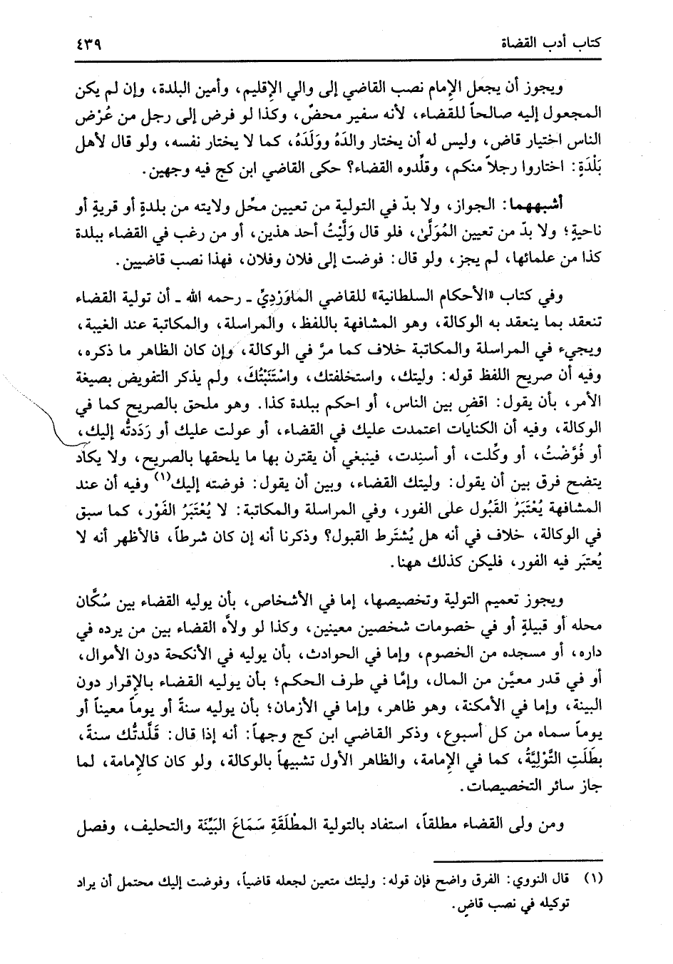 وفي كتاب "الأحكام السلطانية" للقاضي الماوَرْدِيِّ -رحمه الله- أن تولية القضاء تنعقد بما ينعقد به الوكالة، وهو المشافهة باللفظ، والمراسلة، والمكاتبة عند الغيبة، ويجيء في المراسلة والمكاتبة خلاف كما مرَّ في الوكالة، وإن كان الظاهر ما ذكره، وفيه أن صريح اللفظ قوله: وليتك، واستخلفتك، واسْتَنَبْتُكَ، ولم يذكر التفويض بصيغة الأمر، بأن يقول: اقضِ بين الناس، أو احكم ببلدة كذا. وهو ملحق بالصريح كما في الوكالة، وفيه أن الكنايات اعتمدت عليك في القضاء، أو عولت عليك أو رَدَدتُّه إليك, أو فُوَّضْتُ، أو وكَّلت، أو أسنِدت، فينبغي أن يقترن بها ما يلحقها بالصريح، ولا يكاد يتضح فرق بين أن يقول: وليتك القضاء، وبين أن يقول: فوضته إليك (¬1) وفيه أن عند المشافهة يُعْتَبَرُ القَبُول على الفور، وفي المراسلة والمكاتبة: لا يُعْتَبَرُ الفَوْر، كما سبق في الوكالة، خلاف في أنه هل يُشتَرط القبول؟ وذكرنا أنه إن كان شرطاً، فالأظهر أنه لا يُعتبَر فيه الفور، فليكن كذلك هاهنا.