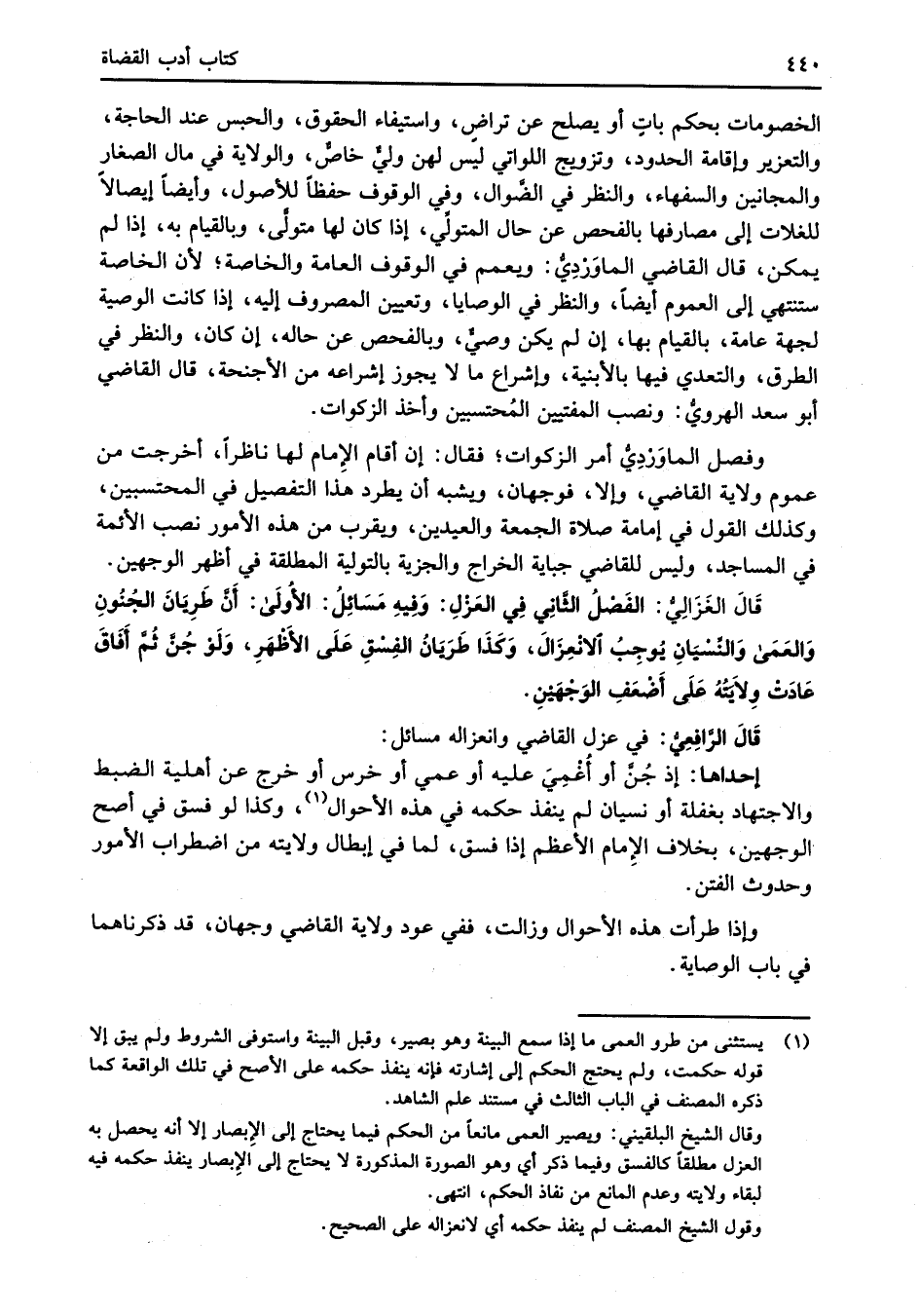وقال الشيخ البلقيني: ويصير العمى مانعاً من الحكم فيما يحتاج إلى الإِبصار إلا أنه يحصل به العزل مطلقاً كالفسق وفيما ذكر أي وهو الصورة المذكورة لا يحتاج إلى الإِبصار ينفذ حكمه فيه لبقاء ولايته وعدم المانع من نفاذ الحكم، انتهى.