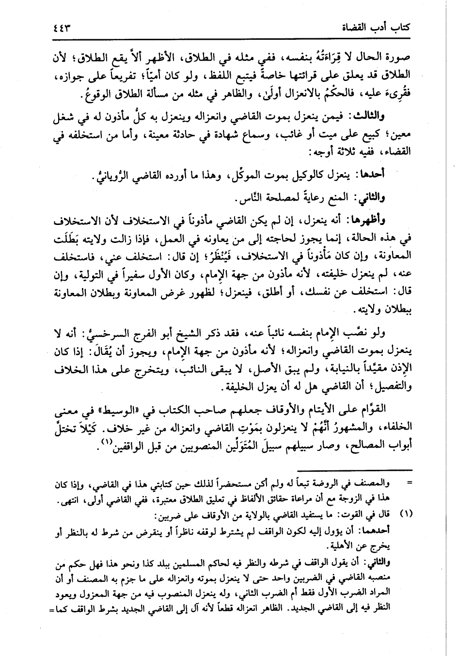 والثاني: أن يقول الواقف في شرطه والنظر فيه لحاكم المسلمين ببلد كذا ونحو هذا فهل حكم من منصبه القاضي في الضربين واحد حتى لا ينعزل بموته وانعزاله على ما جزم به المصنف أو أن المراد الضرب الأول فقط أم الضرب الثاني، وله ينعزل المنصوب فيه من جهة المعزول ويعود النظر فيه إلى القاضي الجديد. الظاهر انعزاله قطعاً لأنه آل إلى القاضي الجديد بشرط الواقف كما =