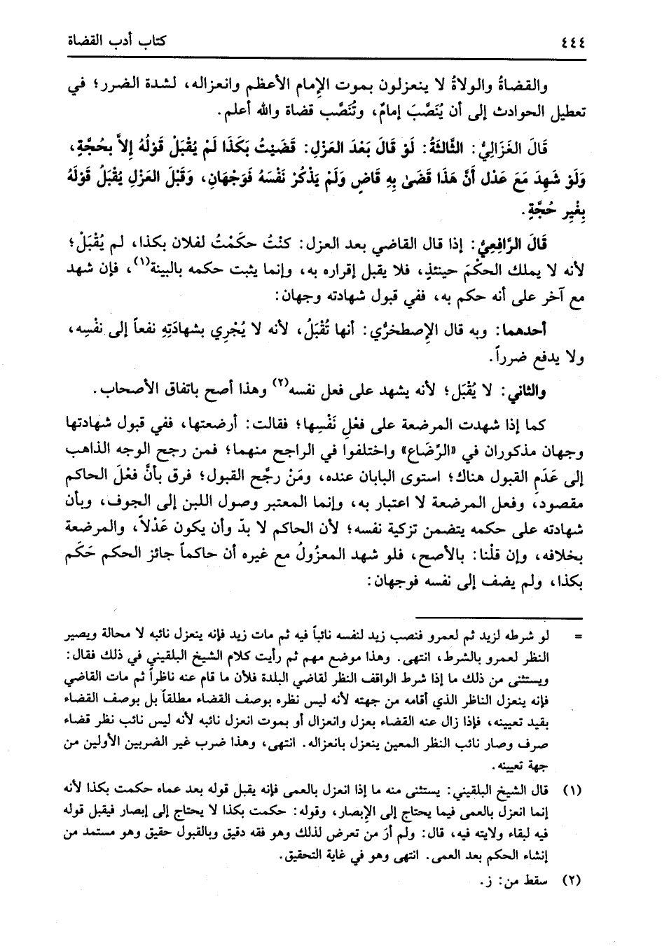 والقضاةُ والولاةُ لا ينعزلون بموت الإِمام الأعظم وانعزاله، لشدة الضرر؛ في تعطيل الحوادث إلى أن يُنَصَّبَ إمامٌ، وتُنَصَّب قضاة والله أعلم.