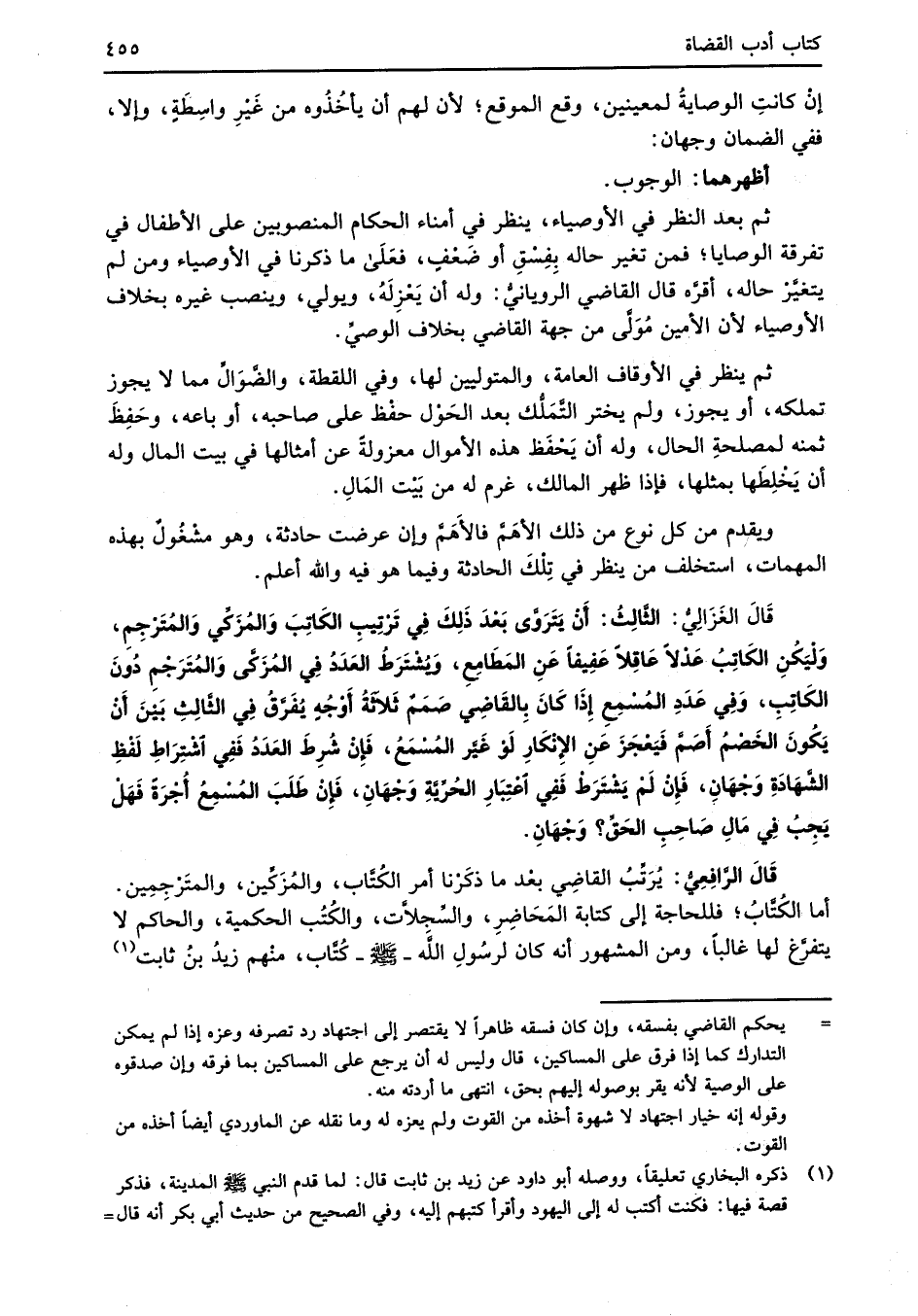 قَالَ الرَّافِعِيُّ: يُرَتِّبُ القاضِي بعْدما ذكَرْنا أمر الكُتَّاب، والمُزَكِّين، والمتَرْجِمِين. أما الكُتَّابُ؛ فللحاجة إلى كتابة المَحَاضِرِ، والسِّجلاَّت، والكُتُب الحكمية، والحاكم لا يتفرَّع لها غالبًا، ومن المشهور أنه كان لرسُولِ الله -صلى الله عليه وسلم- كُتَّاب، منهم زيدُ بنُ ثابت (¬1)