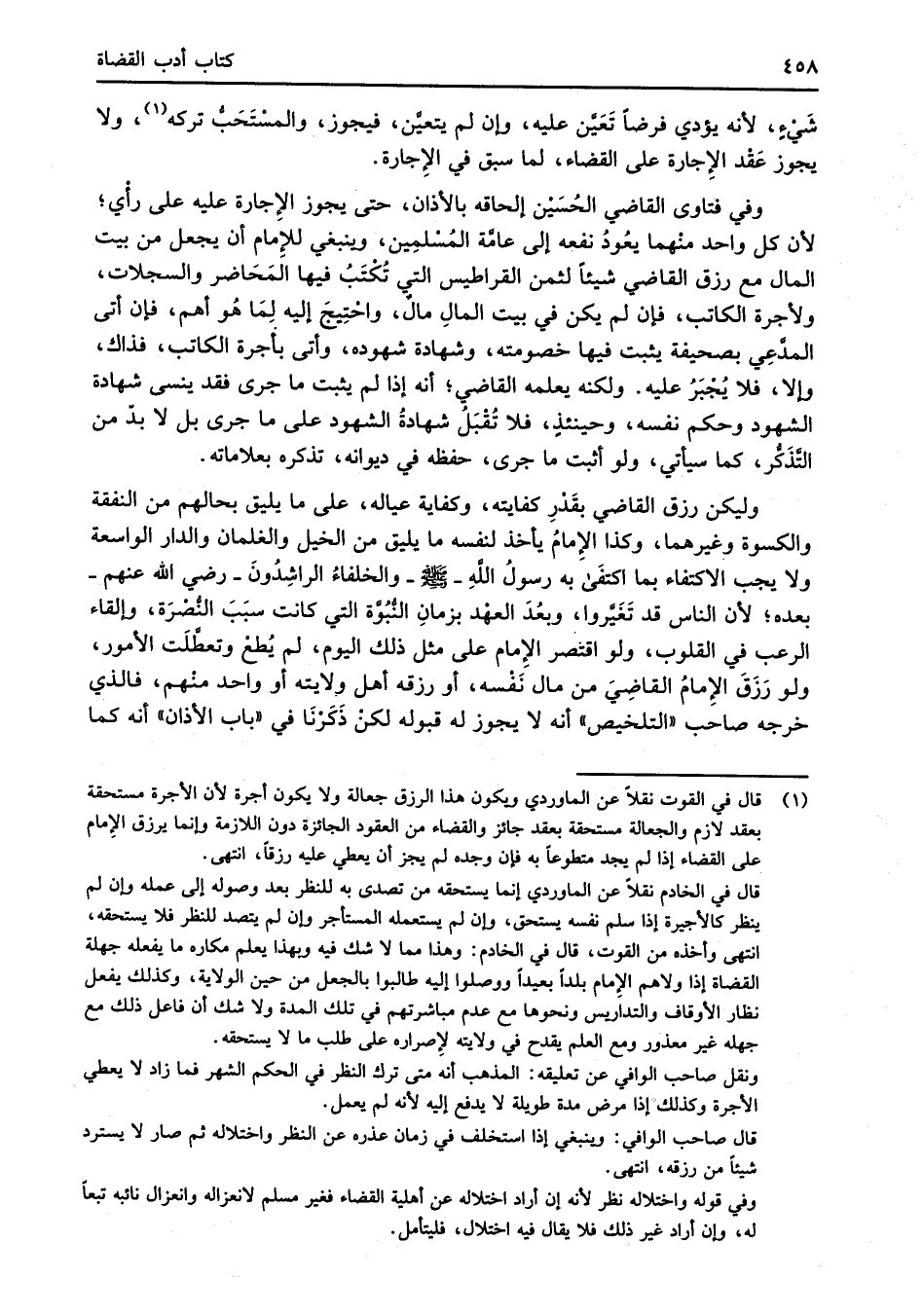 (¬1) قال في القوت نقلاً عن الماوردي ويكون هذا الرزق جعالة ولا يكون أجرة لأن الأجرة مستحقة بعقد لازم والجعالة مستحقة بعقد جائز والقضاء من العقود الجائزة دون اللازمة وإنما يرزق الإِمام على القضاء إذا لم يجد متطوعًا به فإن وجده لم يجز أن يعطي عليه رزقًا، انتهى.