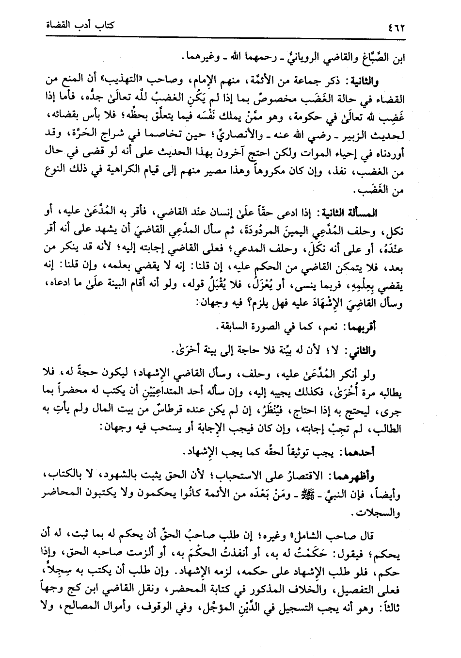 وأظهرهما: الاقتصارُ على الاستحباب؛ لأن الحق يثبت بالشهود، لا بالكتاب، وأيضًا، فإن النبيَّ -صلى الله عليه وسلم- ومَنْ بَعْدَه من الأئمة كانُوا يحكمون ولا يكتبون المحاضر والسجلات.