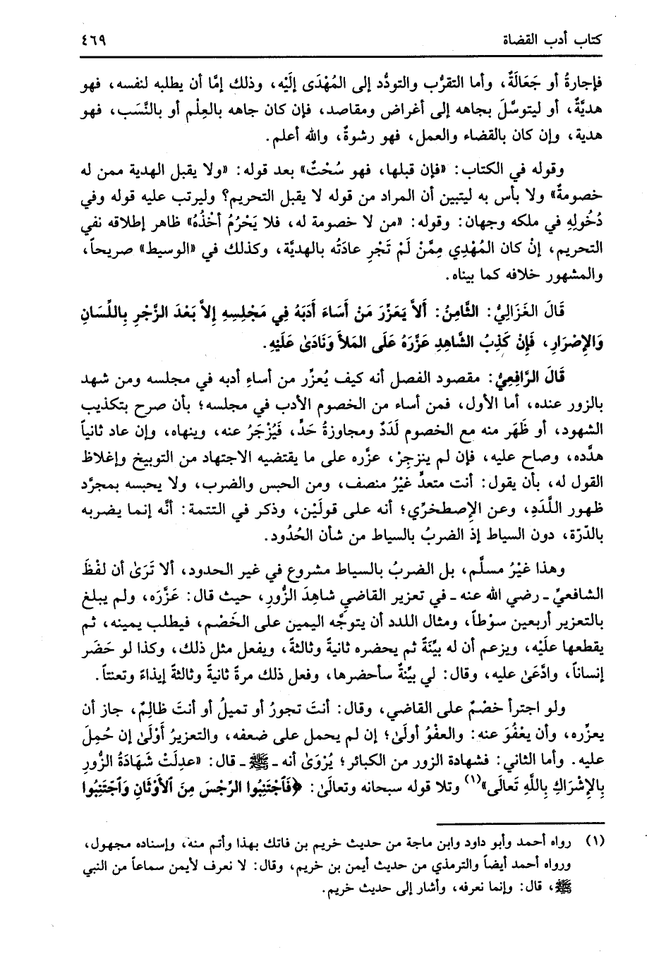 ولو اجترأ خصْمٌ على القاضي، وقال: أنتَ تجورُ أو تميلُ أو أنتَ ظالِمٌ، جاز أن يعزِّره، وأن يعْفُوَ عنه: والعفْوُ أولَى؛ إن لم يحمل على ضعفه، والتعزيرُ أَوْلَى إن حُمِلَ عليه. وأما الثاني: فشهادة الزور من الكبائر؛ يُرْوَى أنه -صلى الله عليه وسلم- قال: "عدِلَتْ شَهَادَةُ الزُّورِ بِالاِشْرَاكِ بِاللهِ تَعالَى" (¬1) وتلا قوله سبحانه وتعالَى: {فَاجْتَنِبُوا الرِّجْسَ مِنَ الْأَوْثَانِ وَاجْتَنِبُوا